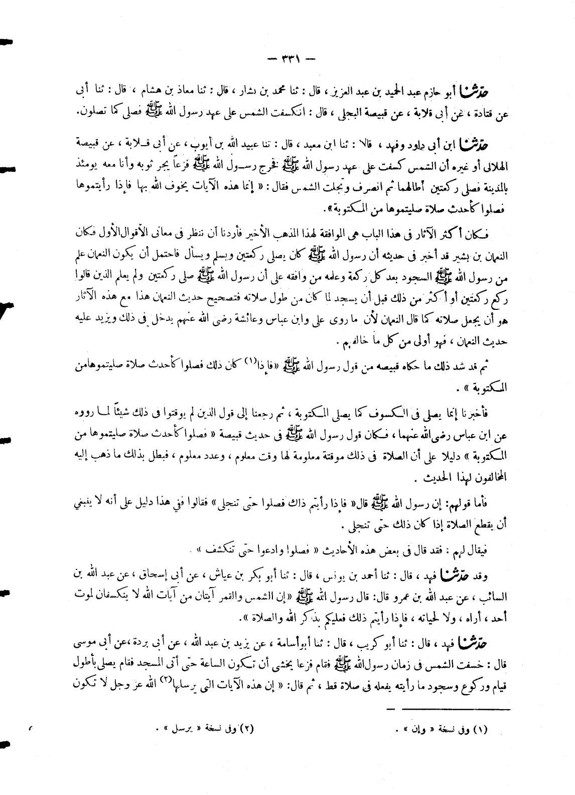 1948 - حَدَّثَنَا ابْنُ أَبِي دَاوُدَ، وَفَهْدٌ، قَالَا: ثنا ابْنُ مَعْبَدٍ، قَالَ: ثنا عُبَيْدِ اللهِ بْنُ أَيُّوبَ، عَنْ أَبِي قِلَابَةَ، عَنْ قَبِيصَةَ الْهِلَالِيِّ، أَوْ غَيْرِهِ: أَنَّ §الشَّمْسَ، كَسَفَتْ عَلَى عَهْدِ رَسُولِ اللهِ صَلَّى اللَّهُ عَلَيْهِ وَسَلَّمَ فَخَرَجَ رَسُولُ اللهِ صَلَّى اللَّهُ عَلَيْهِ وَسَلَّمَ فَزِعًا يَجُرُّ ثَوْبَهُ وَأَنَا مَعَهُ يَوْمَئِذٍ بِالْمَدِينَةِ فَصَلَّى رَكْعَتَيْنِ أَطَالَهُمَا ثُمَّ انْصَرَفَ وَتَجَلَّتِ الشَّمْسُ فَقَالَ: «إِنَّمَا هَذِهِ الْآيَاتُ يُخَوِّفُ اللهُ بِهَا فَإِذَا رَأَيْتُمُوهَا فَصَلُّوا كَأَحْدَثِ صَلَاةٍ صَلَّيْتُمُوهَا مِنَ الْمَكْتُوبَةِ» فَكَانَ أَكْثَرُ الْآثَارِ فِي هَذَا الْبَابِ هِيَ الْمُوَافَقَةَ لِهَذَا الْمَذْهَبِ الْأَخِيرِ فَأَرَدْنَا أَنْ نَنْظُرَ فِي مَعَانِي الْأَقْوَالِ الْأُوَلِ فَكَانَ النُّعْمَانُ بْنُ بَشِيرٍ قَدْ أَخْبَرَ فِي حَدِيثِهِ «أَنَّ رَسُولَ اللهِ صَلَّى اللَّهُ عَلَيْهِ وَسَلَّمَ كَانَ يُصَلِّي رَكْعَتَيْنِ وَيُسَلِّمُ وَيَسْأَلُ» فَاحْتَمَلَ أَنْ يَكُونَ النُّعْمَانُ عَلِمَ مِنْ رَسُولِ اللهِ صَلَّى اللَّهُ عَلَيْهِ وَسَلَّمَ السُّجُودَ بَعْدَ كُلِّ رَكْعَةٍ وَعَلِمَهُ مَنْ وَافَقَهُ عَلَى أَنَّ رَسُولَ اللهِ صَلَّى اللَّهُ عَلَيْهِ وَسَلَّمَ صَلَّى رَكْعَتَيْنِ وَلَمْ يُعْلِمُ الَّذِينَ قَالُوا: رَكَعَ رَكْعَتَيْنِ أَوْ أَكْثَرَ مِنْ ذَلِكَ قَبْلَ أَنْ يَسْجُدَ لَمَّا كَانَ مِنْ طُولِ صَلَاتِهِ فَتَصْحِيحُ حَدِيثِ النُّعْمَانِ هَذَا مَعَ هَذِهِ الْآثَارِ هُوَ أَنْ يَجْعَلَ صَلَاتَهُ كَمَا قَالَ النُّعْمَانُ لِأَنَّ مَا رَوَى عَلِيٌّ وَابْنُ عَبَّاسٍ وَعَائِشَةُ رَضِيَ اللهُ عَنْهُمْ يَدْخُلُ فِي ذَلِكَ وَيَزِيدُ عَلَيْهِ حَدِيثُ النُّعْمَانِ , فَهُوَ أَوْلَى , مِنْ كُلِّ مَا خَالَفَهُمْ. ثُمَّ قَدْ شَدَّ ذَلِكَ مَا حَكَاهُ قَبِيصَةُ مِنْ قَوْلِ رَسُولِ اللهِ صَلَّى اللَّهُ عَلَيْهِ وَسَلَّمَ فَإِذَا كَانَ ذَلِكَ فَصَلُّوا كَأَحْدَثِ صَلَاةٍ صَلَّيْتُمُوهَا مِنَ الْمَكْتُوبَةِ فَأَخْبَرَنَا إِنَّمَا يُصَلِّي فِي الْكُسُوفِ كَمَا يُصَلِّي الْمَكْتُوبَةَ , ثُمَّ رَجَعْنَا إِلَى قَوْلِ الَّذِينَ لَمْ يُوَقِّتُوا فِي ذَلِكَ شَيْئًا لِمَا رَوَوْهُ عَنِ ابْنِ عَبَّاسٍ رَضِيَ اللهُ عَنْهُمَا , فَكَانَ قَوْلُ رَسُولِ اللهِ صَلَّى اللَّهُ عَلَيْهِ وَسَلَّمَ فِي حَدِيثِ قَبِيصَةَ «فَصَلُّوا كَأَحْدَثِ صَلَاةٍ صَلَّيْتُمُوهَا مِنَ الْمَكْتُوبَةِ» دَلِيلًا عَلَى أَنَّ الصَّلَاةَ فِي ذَلِكَ مُؤَقَّتَةٌ مَعْلُومَةٌ لَهَا وَقْتٌ مَعْلُومٌ , وَعَدَدٌ مَعْلُومٌ , فَبَطَلَ بِذَلِكَ مَا ذَهَبَ إِلَيْهِ الْمُخَالِفُونَ لِهَذَا الْحَدِيثِ. فَأَمَّا قَوْلُهُمْ: إِنَّ رَسُولَ اللهِ صَلَّى اللَّهُ عَلَيْهِ وَسَلَّمَ قَالَ: «فَإِذَا رَأَيْتُمْ ذَلِكَ فَصَلُّوا حَتَّى تَنْجَلِيَ» فَقَالُوا فَفِي هَذَا دَلِيلٌ عَلَى أَنَّهُ لَا يَنْبَغِي أَنْ يَقْطَعَ الصَّلَاةَ إِذَا كَانَ ذَلِكَ حَتَّى تَنْجَلِيَ. فَيُقَالُ لَهُمْ: فَقَدْ قَالَ فِي بَعْضِ هَذِهِ الْأَحَادِيثِ «فَصَلُّوا وَادْعُوا حَتَّى تَنْكَشِفَ»