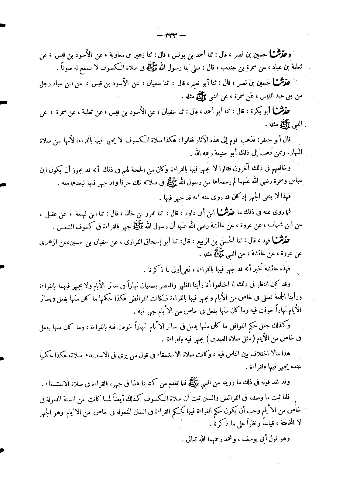 1960 - حَدَّثَنَا فَهْدٌ، قَالَ: ثنا الْحَسَنُ بْنُ الرَّبِيعِ، قَالَ: ثنا أَبُو إِسْحَاقَ الْفَزَارِيُّ، عَنْ سُفْيَانَ بْنِ حُسَيْنٍ، عَنِ الزُّهْرِيِّ، عَنْ عُرْوَةَ، عَنْ عَائِشَةَ، عَنِ النَّبِيِّ صَلَّى اللَّهُ عَلَيْهِ وَسَلَّمَ مِثْلَهُ فَهَذِهِ عَائِشَةُ تُخْبِرُ أَنَّهُ قَدْ جَهَرَ فِيهَا بِالْقِرَاءَةِ , فَهِيَ أَوْلَى لِمَا ذَكَرْنَا. وَقَدْ كَانَ النَّظَرُ فِي ذَلِكَ لَمَّا اخْتَلَفُوا أَنَّا رَأَيْنَا الظُّهْرَ وَالْعَصْرَ يُصَلَّيَانِ نَهَارًا فِي سَائِرِ الْأَيَّامِ وَلَا يُجْهَرُ فِيهِمَا بِالْقِرَاءَةِ وَرَأَيْنَا الْجُمُعَةَ تُصَلَّى فِي خَاصٍّ مِنَ الْأَيَّامِ وَيُجْهَرُ فِيهَا بِالْقِرَاءَةِ فَكَانَتِ الْفَرَائِضُ هَكَذَا حُكْمُهَا مَا كَانَ مِنْهَا يُفْعَلُ فِي سَائِرِ الْأَيَّامِ نَهَارًا خُوفِتَ فِيهِ وَمَا كَانَ مِنْهَا يُفْعَلُ فِي خَاصٍّ مِنَ الْأَيَّامِ جُهِرَ فِيهِ. وَكَذَلِكَ جُعِلَ حُكْمُ النَّوَافِلِ مَا كَانَ مِنْهَا يُفْعَلُ فِي سَائِرِ الْأَيَّامِ نَهَارًا خُوفِتَ فِيهِ بِالْقِرَاءَةِ , وَمَا كَانَ مِنْهَا يُفْعَلُ فِي خَاصٍّ مِنَ الْأَيَّامِ مِثْلَ صَلَاةِ الْعِيدَيْنِ يُجْهَرُ فِيهِ بِالْقِرَاءَةِ. هَذَا مَا لَا اخْتِلَافَ بَيْنَ النَّاسِ فِيهِ , وَكَانَتْ صَلَاةُ الِاسْتِسْقَاءِ فِي قَوْلِ مَنْ يَرَى فِي الِاسْتِسْقَاءِ صَلَاةً , هَكَذَا حُكْمُهَا عِنْدَهُ يُجْهَرُ فِيهَا بِالْقِرَاءَةِ. وَقَدْ شَذَّ قَوْلُهُ فِي ذَلِكَ مَا رَوَيْنَا عَنِ النَّبِيِّ صَلَّى اللَّهُ عَلَيْهِ وَسَلَّمَ فِيمَا تَقَدَّمَ مِنْ كِتَابِنَا هَذَا فِي جَهْرِهِ بِالْقِرَاءَةِ فِي صَلَاةِ الِاسْتِسْقَاءِ. فَلَمَّا ثَبَتَ مَا وَصَفْنَا فِي الْفَرَائِضِ وَالسُّنَنِ ثَبَتَ أَنَّ صَلَاةَ الْكُسُوفِ كَذَلِكَ أَيْضًا لَمَّا كَانَتْ مِنَ السُّنَّةِ الْمَفْعُولَةِ فِي خَاصٍّ مِنَ الْأَيَّامِ وَجَبَ أَنْ يَكُونَ حُكْمُ الْقِرَاءَةِ فِيهَا كَحُكْمِ الْقِرَاءَةِ فِي السُّنَنِ الْمَفْعُولَةِ فِي خَاصٍّ مِنَ الْأَيَّامِ , وَهُوَ الْجَهْرُ لَا الْمُخَافَتَةَ , قِيَاسًا وَنَظَرًا عَلَى مَا ذَكَرْنَا. وَهُوَ قَوْلُ أَبِي يُوسُفَ , وَمُحَمَّدٍ رَحِمَهُمَا اللهُ تَعَالَى. -[334]- وَقَدْ رُوِيَ ذَلِكَ أَيْضًا , عَنْ عَلِيِّ بْنِ أَبِي طَالِبٍ رَضِيَ اللهُ عَنْهُ