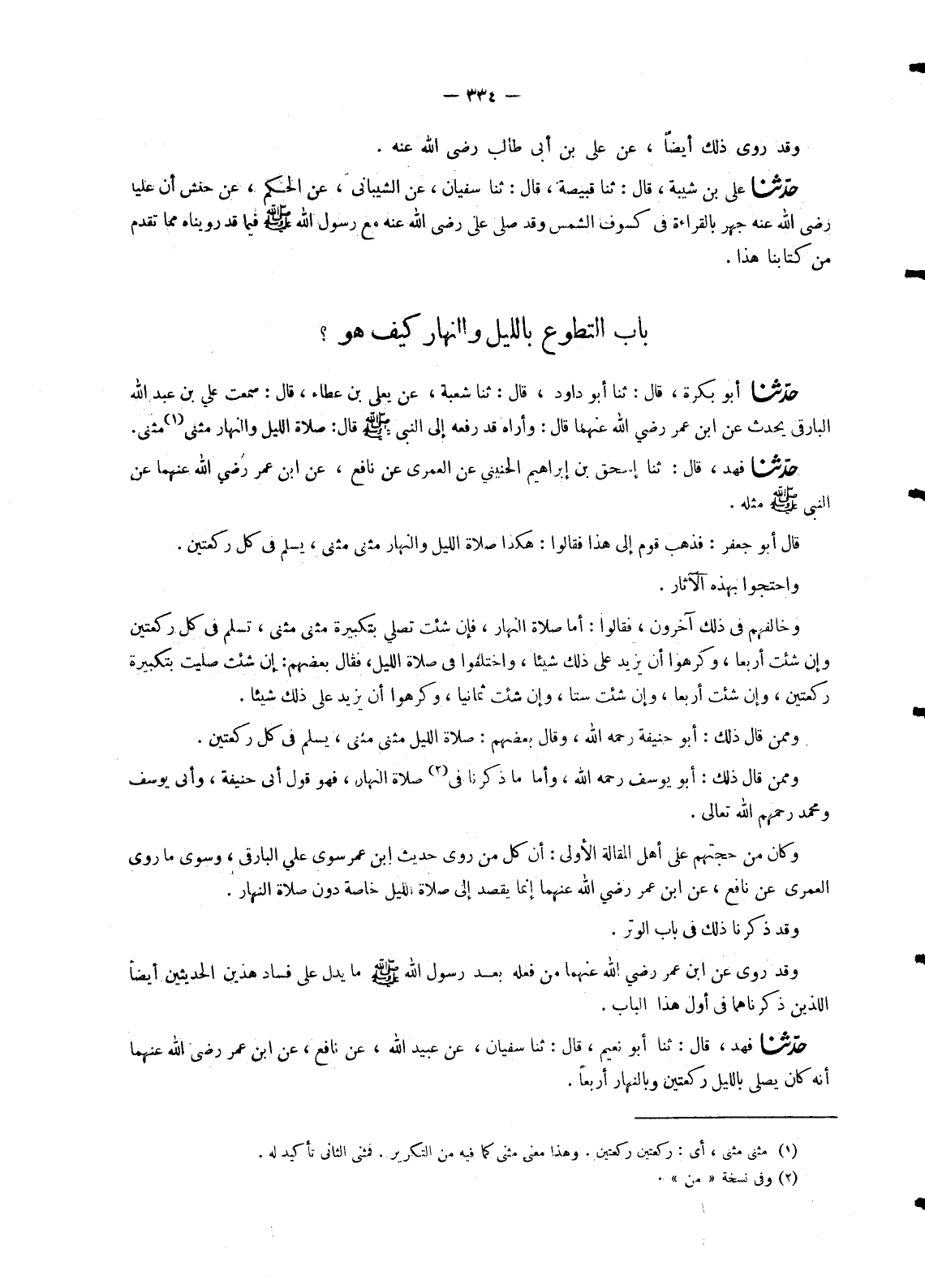 1963 - حَدَّثَنَا فَهْدٌ، قَالَ: ثنا إِسْحَاقُ بْنُ إِبْرَاهِيمَ الْحُنَيْنِيُّ، عَنِ الْعُمَرِيِّ، عَنْ نَافِعٍ، عَنِ ابْنِ عُمَرَ، رَضِيَ اللهُ عَنْهُمَا عَنِ النَّبِيِّ صَلَّى اللَّهُ عَلَيْهِ وَسَلَّمَ مِثْلَهُ قَالَ أَبُو جَعْفَرٍ: فَذَهَبَ قَوْمٌ إِلَى هَذَا فَقَالُوا: هَكَذَا صَلَاةُ اللَّيْلِ وَالنَّهَارِ مَثْنَى مَثْنَى , يُسَلِّمُ فِي كُلِّ رَكْعَتَيْنِ. وَاحْتَجُّوا بِهَذِهِ الْآثَارِ. وَخَالَفَهُمْ فِي ذَلِكَ آخَرُونَ , فَقَالُوا: أَمَّا صَلَاةُ النَّهَارِ , فَإِنْ شِئْتَ تُصَلِّي بِتَكْبِيرَةٍ مَثْنَى مَثْنَى , تُسَلِّمُ فِي كُلِّ رَكْعَتَيْنِ وَإِنْ شِئْتَ أَرْبَعًا , وَكَرِهُوا أَنْ يَزِيدَ عَلَى ذَلِكَ شَيْئًا , وَاخْتَلَفُوا فِي صَلَاةِ اللَّيْلِ , فَقَالَ بَعْضُهُمْ: إِنْ شِئْتَ صَلَّيْتَ بِتَكْبِيرَةٍ رَكْعَتَيْنِ , وَإِنْ شِئْتَ أَرْبَعًا , وَإِنْ شِئْتَ سِتًّا , وَإِنْ شِئْتَ ثَمَانِيًا , وَكَرِهُوا أَنْ يَزِيدَ عَلَى ذَلِكَ شَيْئًا. وَمِمَّنْ قَالَ ذَلِكَ: أَبُو حَنِيفَةَ رَحِمَهُ اللهُ , وَقَالَ بَعْضُهُمْ: صَلَاةُ اللَّيْلِ مَثْنَى مَثْنَى , يُسَلِّمُ فِي كُلِّ رَكْعَتَيْنِ. وَمِمَّنْ قَالَ ذَلِكَ: أَبُو يُوسُفَ رَحِمَهُ اللهُ , وَأَمَّا مَا ذَكَرْنَا فِي صَلَاةِ النَّهَارِ , فَهُوَ قَوْلُ أَبِي حَنِيفَةَ , وَأَبِي يُوسُفَ وَمُحَمَّدٍ رَحِمَهُمُ اللهُ تَعَالَى. وَكَانَ مِنْ حُجَّتِهِمْ عَلَى أَهْلِ الْمَقَالَةِ الْأُولَى: أَنَّ كُلَّ مَنْ رَوَى حَدِيثَ ابْنِ عُمَرَ سِوَى عَلِيٍّ الْبَارِقِيِّ , وَسِوَى مَا رَوَى الْعُمَرِيُّ عَنْ نَافِعٍ , عَنِ ابْنِ عُمَرَ رَضِيَ اللهُ عَنْهُمَا إِنَّمَا يَقْصِدُ إِلَى صَلَاةِ اللَّيْلِ خَاصَّةً دُونَ صَلَاةِ النَّهَارِ. وَقَدْ ذَكَرْنَا ذَلِكَ فِي بَابِ الْوِتْرِ. وَقَدْ رُوِيَ عَنِ ابْنِ عُمَرَ رَضِيَ اللهُ عَنْهُمَا مِنْ فِعْلِهِ بَعْدَ رَسُولِ اللهِ صَلَّى اللَّهُ عَلَيْهِ وَسَلَّمَ مَا يَدُلُّ عَلَى فَسَادِ هَذَيْنِ الْحَدِيثَيْنِ أَيْضًا الَّذِينَ ذَكَرْنَاهُمَا فِي أَوَّلِ هَذَا الْبَابِ