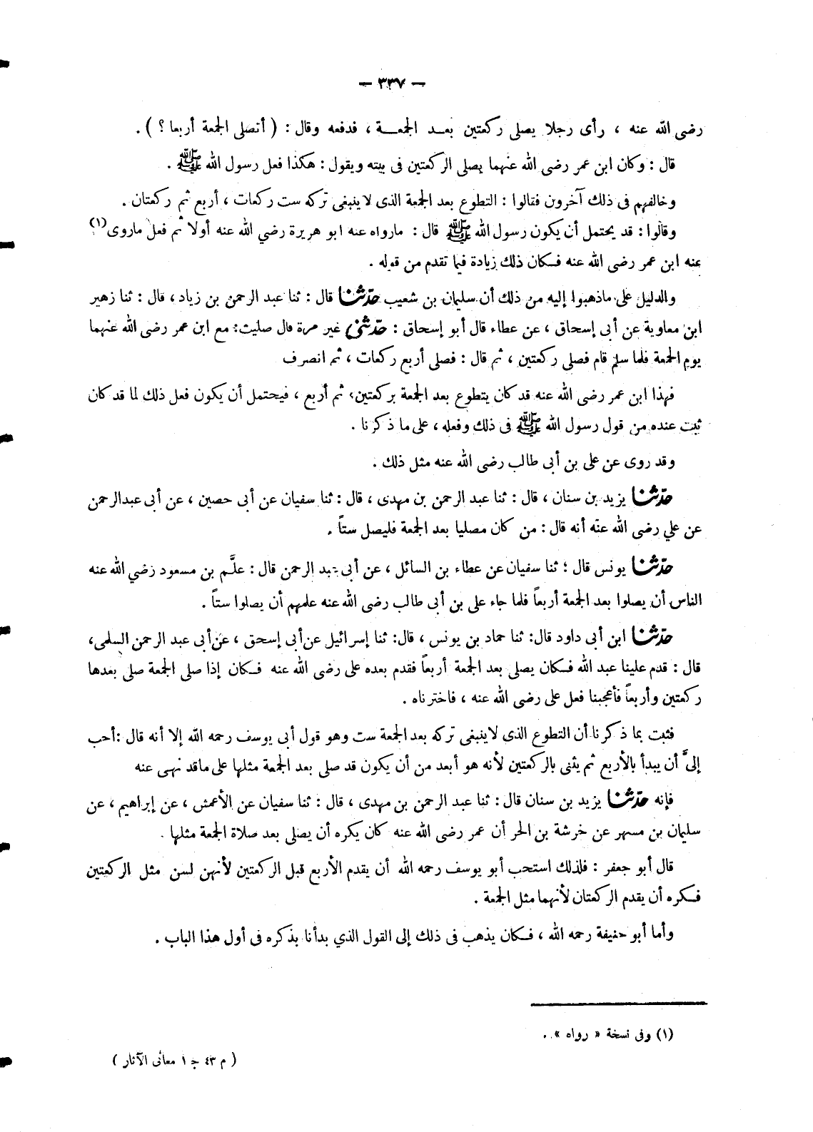 1980 - حَدَّثَنَا ابْنُ أَبِي دَاوُدَ، قَالَ: ثنا حَمَّادُ بْنُ يُونُسَ، قَالَ: ثنا إِسْرَائِيلُ، عَنْ أَبِي إِسْحَاقَ، عَنْ أَبِي عَبْدِ الرَّحْمَنِ السُّلَمِيِّ، قَالَ: «قَدِمَ عَلَيْنَا عَبْدُ اللهِ فَكَانَ §يُصَلِّي بَعْدَ الْجُمُعَةِ أَرْبَعًا فَقَدِمَ بَعْدَهُ عَلِيٌّ رَضِيَ اللهُ عَنْهُ فَكَانَ إِذَا صَلَّى الْجُمُعَةَ صَلَّى بَعْدَهَا رَكْعَتَيْنِ وَأَرْبَعًا فَأَعْجَبَنَا فِعْلُ عَلِيٍّ رَضِيَ اللهُ عَنْهُ فَاخْتَرْنَاهُ» فَثَبَتَ بِمَا ذَكَرْنَا أَنَّ التَّطَوُّعَ الَّذِي لَا يَنْبَغِي تَرْكُهُ بَعْدَ الْجُمُعَةِ سِتٌّ , وَهُوَ قَوْلُ أَبِي يُوسُفَ رَحِمَهُ اللهُ إِلَّا أَنَّهُ قَالَ: أَحَبُّ إِلَيَّ أَنْ يُبْدَأَ بِالْأَرْبَعِ ثُمَّ يُثَنَّى بِالرَّكْعَتَيْنِ لِأَنَّهُ هُوَ أَبْعَدُ مِنْ أَنْ يَكُونَ قَدْ صَلَّى بَعْدَ الْجُمُعَةِ مِثْلَهَا عَلَى مَا قَدْ نُهِيَ عَنْهُ