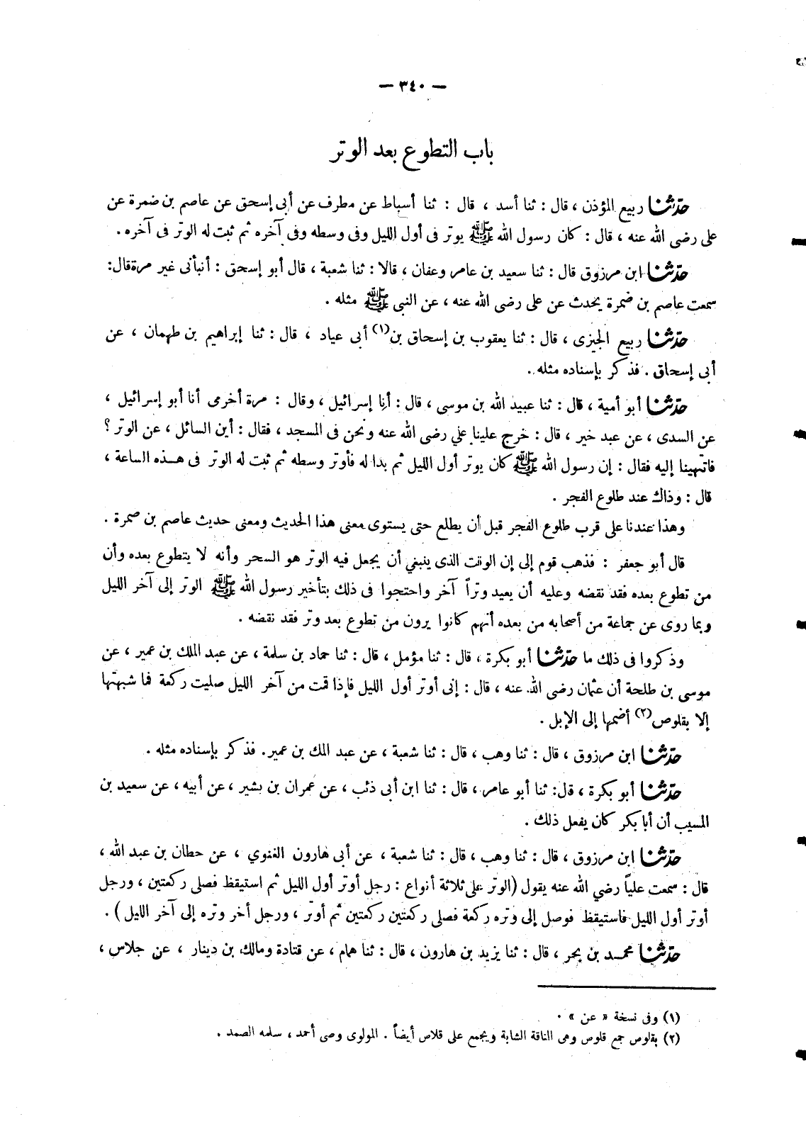 1996 - حَدَّثَنَا رَبِيعٌ الْمُؤَذِّنُ , قَالَ: ثنا أَسَدٌ , قَالَ: ثنا أَسْبَاطٌ عَنْ مُطَرِّفٍ عَنْ أَبِي إِسْحَاقَ عَنْ عَاصِمِ بْنِ ضَمْرَةَ عَنْ عَلِيٍّ رَضِيَ اللهُ عَنْهُ , قَالَ: «كَانَ رَسُولُ اللهِ صَلَّى اللَّهُ عَلَيْهِ وَسَلَّمَ §يُوتِرُ فِي أَوَّلِ اللَّيْلِ وَفِي وَسَطِهِ وَفِي آخِرِهِ ثُمَّ ثَبَتَ لَهُ الْوِتْرُ فِي آخِرِهِ»