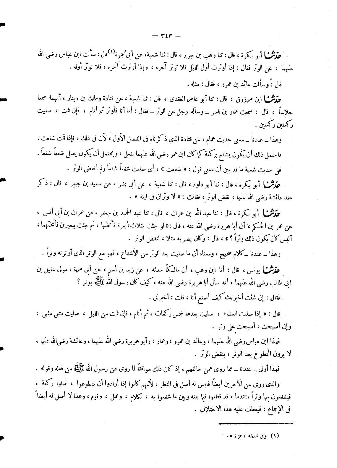 2018 - حَدَّثَنَا أَبُو بَكْرَةَ , قَالَ: ثنا وَهْبُ بْنُ جَرِيرٍ , قَالَ: ثنا شُعْبَةُ , عَنْ أَبِي جَمْرَةَ قَالَ: سَأَلْتُ ابْنَ عَبَّاسٍ رَضِيَ اللهُ عَنْهُمَا , عَنِ الْوِتْرِ فَقَالَ: «§إِذَا أَوْتَرْتَ أَوَّلَ اللَّيْلِ فَلَا تُوتِرْ آخِرَهُ , وَإِذَا أَوْتَرْتَ آخِرَهُ , فَلَا تُوتِرْ أَوَّلَهُ» قَالَ: وَسَأَلْتُ عَائِذَ بْنَ عَمْرٍو , فَقَالَ مِثْلَهُ