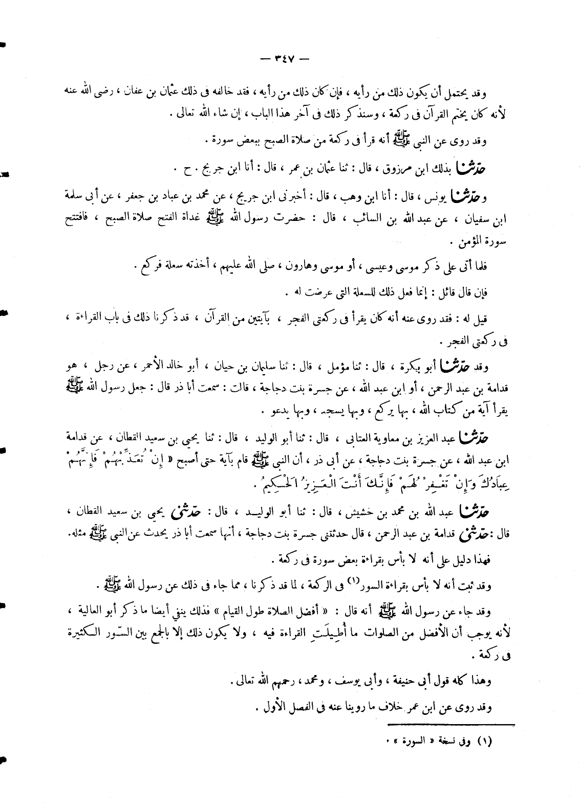 2044 - حَدَّثَنَا عَبْدُ اللهِ بْنُ مُحَمَّدِ بْنِ خُشَيْشٍ، قَالَ: ثنا أَبُو الْوَلِيدِ، قَالَ: حَدَّثَنِي يَحْيَى بْنُ سَعِيدٍ الْقَطَّانُ، قَالَ: حَدَّثَنِي قُدَامَةُ بْنُ عَبْدِ الرَّحْمَنِ، قَالَ: حَدَّثَتْنِي جَسْرَةُ بِنْتُ دَجَاجَةَ، أَنَّهَا سَمِعَتْ أَبَا ذَرٍّ، يُحَدِّثُ عَنِ النَّبِيِّ صَلَّى اللَّهُ عَلَيْهِ وَسَلَّمَ مِثْلَهُ فَهَذَا دَلِيلٌ عَلَى أَنَّهُ لَا بَأْسَ بِقِرَاءَةِ بَعْضِ سُورَةٍ فِي رَكْعَةٍ. وَقَدْ ثَبَتَ أَنَّهُ لَا بَأْسَ بِقِرَاءَةِ السُّوَرِ فِي الرَّكْعَةِ ; لِمَا قَدْ ذَكَرْنَا , مِمَّا جَاءَ فِي ذَلِكَ عَنْ رَسُولِ اللهِ صَلَّى اللَّهُ عَلَيْهِ وَسَلَّمَ. وَقَدْ جَاءَ عَنْ رَسُولِ اللهِ صَلَّى اللَّهُ عَلَيْهِ وَسَلَّمَ أَنَّهُ قَالَ: «أَفْضَلُ الصَّلَاةِ طُولُ الْقِيَامِ» فَذَلِكَ يَنْفِي أَيْضًا مَا ذَكَرَ أَبُو الْعَالِيَةِ , لِأَنَّهُ يُوجِبُ أَنَّ الْأَفْضَلَ مِنَ الصَّلَوَاتِ مَا أُطِيلَتِ الْقِرَاءَةُ فِيهِ , وَلَا يَكُونُ ذَلِكَ إِلَّا بِالْجَمْعِ بَيْنَ السُّوَرِ الْكَثِيرَةِ فِي رَكْعَةٍ. وَهَذَا كُلُّهُ قَوْلُ أَبِي حَنِيفَةَ , وَأَبِي يُوسُفَ , وَمُحَمَّدٍ , رَحِمَهُمُ اللهُ تَعَالَى. وَقَدْ رُوِيَ عَنِ ابْنِ عُمَرَ خِلَافُ مَا رَوَيْنَا عَنْهُ فِي الْفَصْلِ الْأَوَّلِ