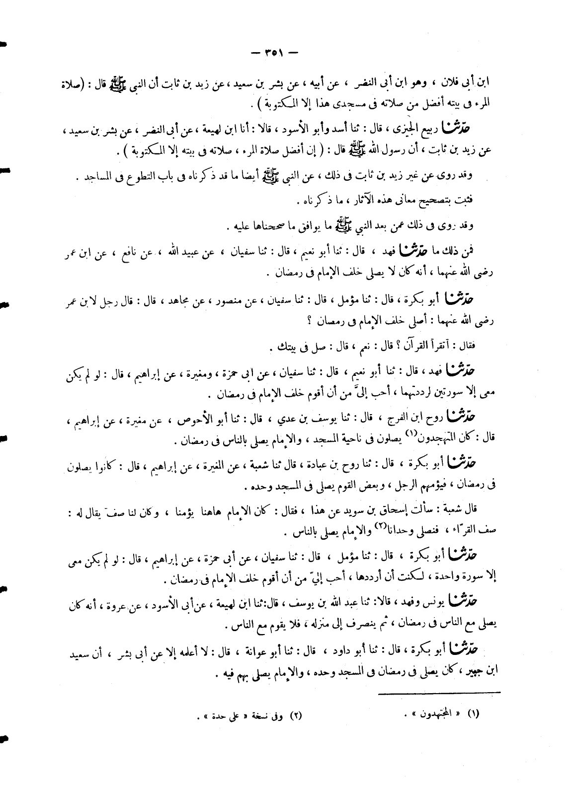 2063 - حَدَّثَنَا رَوْحُ بْنُ الْفَرَجِ، قَالَ: ثنا يُوسُفُ بْنُ عَدِيٍّ، قَالَ: ثنا أَبُو الْأَحْوَصِ، عَنْ مُغِيرَةَ، عَنْ إِبْرَاهِيمَ، قَالَ: «§كَانَ الْمُتَهَجِّدُونَ يُصَلُّونَ فِي نَاحِيَةِ الْمَسْجِدِ , وَالْإِمَامُ يُصَلِّي بِالنَّاسِ فِي رَمَضَانَ»