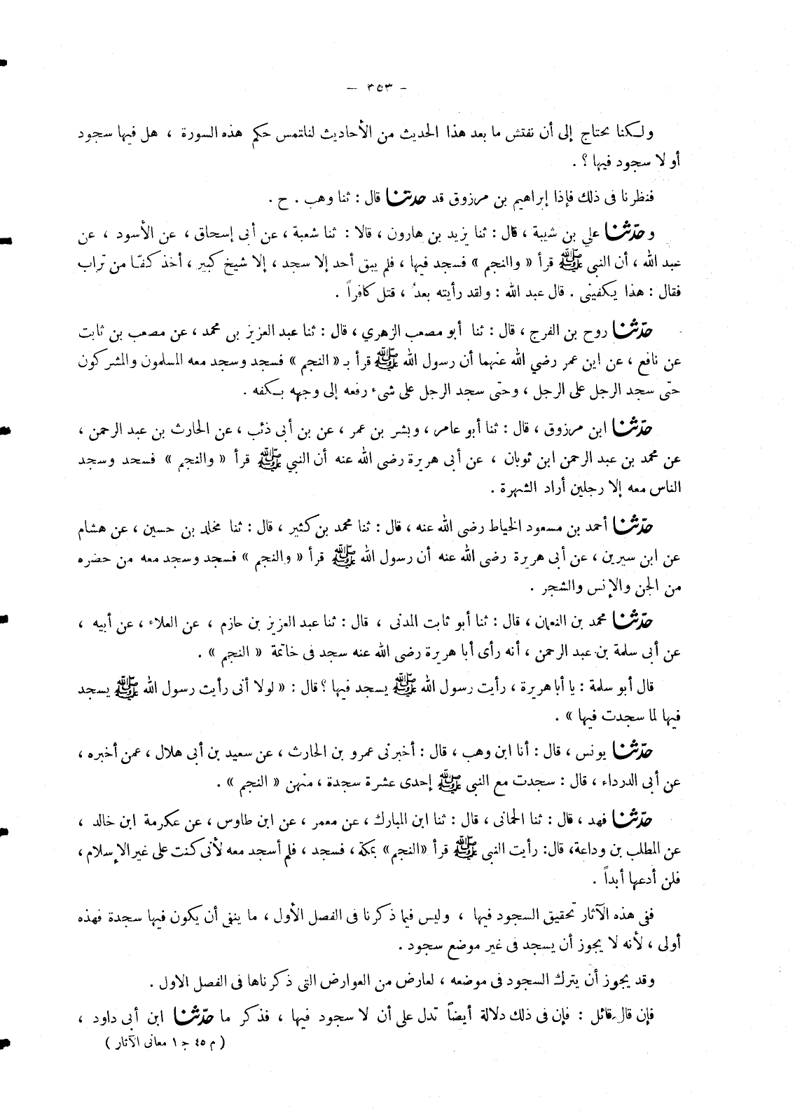 2081 - حَدَّثَنَا فَهْدٌ، قَالَ: ثنا الْحِمَّانِيُّ، قَالَ: ثنا ابْنُ الْمُبَارَكِ، عَنْ مَعْمَرٍ، عَنِ ابْنِ طَاوُسٍ، عَنْ عِكْرِمَةَ بْنِ خَالِدٍ، عَنِ الْمُطَّلِبِ بْنِ وَدَاعَةَ، قَالَ: «رَأَيْتُ النَّبِيَّ صَلَّى اللَّهُ عَلَيْهِ وَسَلَّمَ §قَرَأَ النَّجْمَ بِمَكَّةَ , فَسَجَدَ , فَلَمْ أَسْجُدْ مَعَهُ لِأَنِّي كُنْتُ عَلَى غَيْرِ الْإِسْلَامِ , فَلَنْ أَدَعَهَا أَبَدًا» فَفِي هَذِهِ الْآثَارِ تَحْقِيقُ السُّجُودِ فِيهَا , وَلَيْسَ فِيمَا ذَكَرْنَا فِي الْفَصْلِ الْأَوَّلِ , مَا يَنْفِي أَنْ يَكُونَ فِيهَا سَجْدَةٌ فَهَذِهِ أَوْلَى , لِأَنَّهُ لَا يَجُوزُ أَنْ يُسْجَدَ فِي غَيْرِ مَوْضِعِ سُجُودٍ. وَقَدْ يَجُوزُ أَنْ يُتْرَكَ السُّجُودُ فِي مَوْضِعِهِ , لِعَارِضٍ مِنَ الْعَوَارِضِ الَّتِي ذَكَرْنَاهَا فِي الْفَصْلِ الْأَوَّلِ. فَإِنْ قَالَ قَائِلٌ: فَإِنَّ فِي ذَلِكَ دَلَالَةً أَيْضًا تَدُلُّ عَلَى أَنْ لَا سُجُودَ فِيهَا