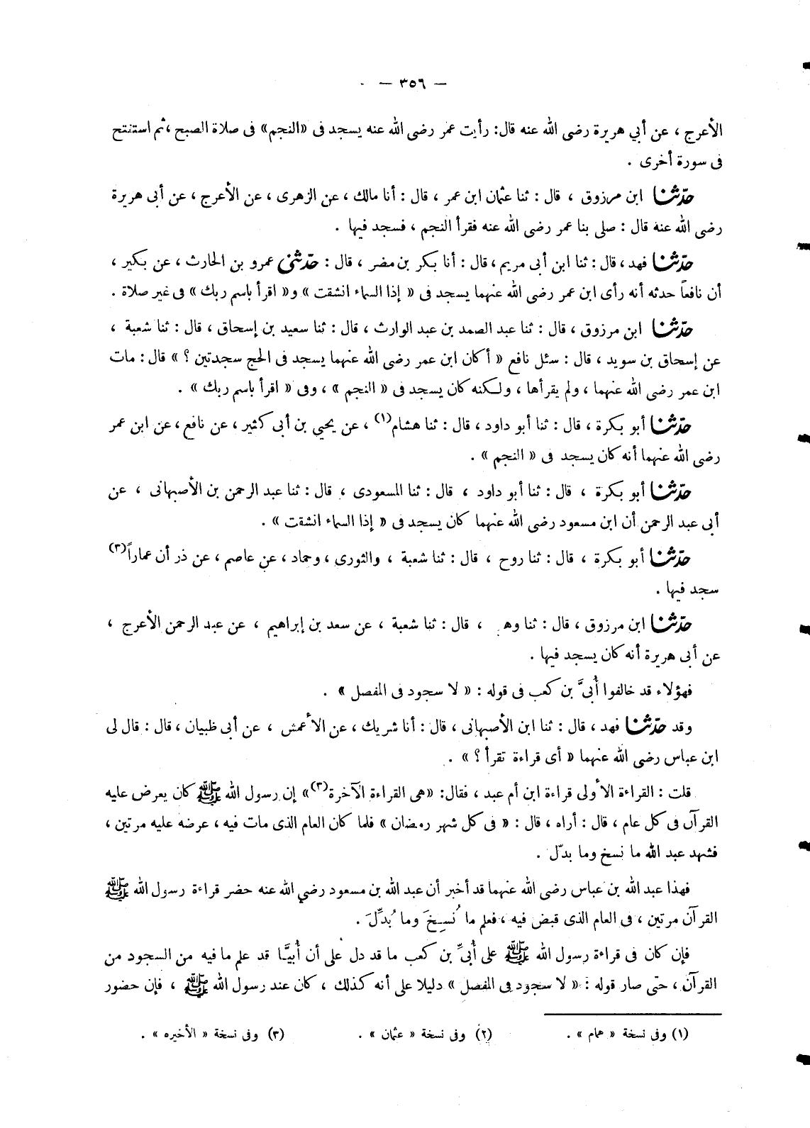 2105 - وَقَدْ حَدَّثَنَا فَهْدٌ , قَالَ: ثنا ابْنُ الْأَصْبَهَانِيِّ , قَالَ: أنا شَرِيكٌ , عَنِ الْأَعْمَشِ , عَنْ أَبِي ظَبْيَانَ , قَالَ: قَالَ لِي ابْنُ عَبَّاسٍ رَضِيَ اللهُ عَنْهُمَا: " أَيَّ قِرَاءَةٍ تَقْرَأُ؟ . قُلْتُ: الْقِرَاءَةَ الْأُولَى قِرَاءَةَ ابْنِ أُمِّ عَبْدٍ , فَقَالَ: هِيَ الْقِرَاءَةُ الْآخِرَةُ إِنَّ رَسُولَ اللهِ صَلَّى اللَّهُ عَلَيْهِ وَسَلَّمَ كَانَ §يُعْرَضُ عَلَيْهِ الْقُرْآنُ فِي كُلِّ عَامٍ , قَالَ: أُرَاهُ , قَالَ: فِي كُلِّ شَهْرِ رَمَضَانَ فَلَمَّا كَانَ الْعَامُ الَّذِي مَاتَ فِيهِ , عَرَضَهُ عَلَيْهِ مَرَّتَيْنِ , فَشَهِدَ عَبْدُ اللهِ مَا نُسِخَ وَمَا بُدِّلَ " فَهَذَا عَبْدُ اللهِ بْنُ عَبَّاسٍ رَضِيَ اللهُ عَنْهُمَا قَدْ أَخْبَرَ أَنَّ عَبْدَ اللهِ بْنَ مَسْعُودٍ رَضِيَ اللهُ عَنْهُ حَضَرَ قِرَاءَةَ رَسُولِ اللهِ صَلَّى اللَّهُ عَلَيْهِ وَسَلَّمَ الْقُرْآنَ مَرَّتَيْنِ , فِي الْعَامِ الَّذِي قُبِضَ فِيهِ , فَعَلِمَ مَا نُسِخَ وَمَا بُدِّلَ. فَإِنْ كَانَ فِي قِرَاءَةِ رَسُولِ اللهِ صَلَّى اللَّهُ عَلَيْهِ وَسَلَّمَ عَلَى أُبَيِّ بْنِ كَعْبٍ مَا قَدْ دَلَّ عَلَى أَنَّ أُبَيًّا قَدْ عَلِمَ مَا فِيهِ مِنَ السُّجُودِ مِنَ الْقُرْآنِ , حَتَّى صَارَ قَوْلُهُ: «لَا سُجُودَ فِي الْمُفَصَّلِ» دَلِيلًا عَلَى أَنَّهُ كَذَلِكَ , كَانَ عِنْدَ رَسُولِ اللهِ صَلَّى اللَّهُ عَلَيْهِ وَسَلَّمَ , فَإِنَّ حُضُورَ -[357]- ابْنِ مَسْعُودٍ رَضِيَ اللهُ عَنْهُ قِرَاءَةَ رَسُولِ اللهِ صَلَّى اللَّهُ عَلَيْهِ وَسَلَّمَ الْقُرْآنَ مَرَّتَيْنِ , دَلِيلٌ عَلَى أَنَّهُ قَدْ عَلِمَ مَا فِيهِ السُّجُودُ مِنَ الْقُرْآنِ , فَصَارَ قَوْلُهُ: «إِنَّ الْمُفَصَّلَ مِنَ السُّجُودِ» مَا رَوَيْنَاهُ عَنْهُ حُجَّةٌ. وَقَالَ قَوْمٌ: قَدْ كَانَ رَسُولُ اللهِ صَلَّى اللَّهُ عَلَيْهِ وَسَلَّمَ يَسْجُدُ فِي الْمُفَصَّلِ بِمَكَّةَ , فَلَمَّا هَاجَرَ , تَرَكَ ذَلِكَ. وَرَوَوْا ذَلِكَ عَنِ ابْنِ عَبَّاسٍ رَضِيَ اللهُ عَنْهُمَا مِنْ طَرِيقٍ ضَعِيفٍ , لَا يَثْبُتُ مِثْلُهُ , وَرَوَوْا عَنْهُ مِنْ قَوْلِهِ: «إِنَّهُ لَا سُجُودَ فِي الْمُفَصَّلِ»