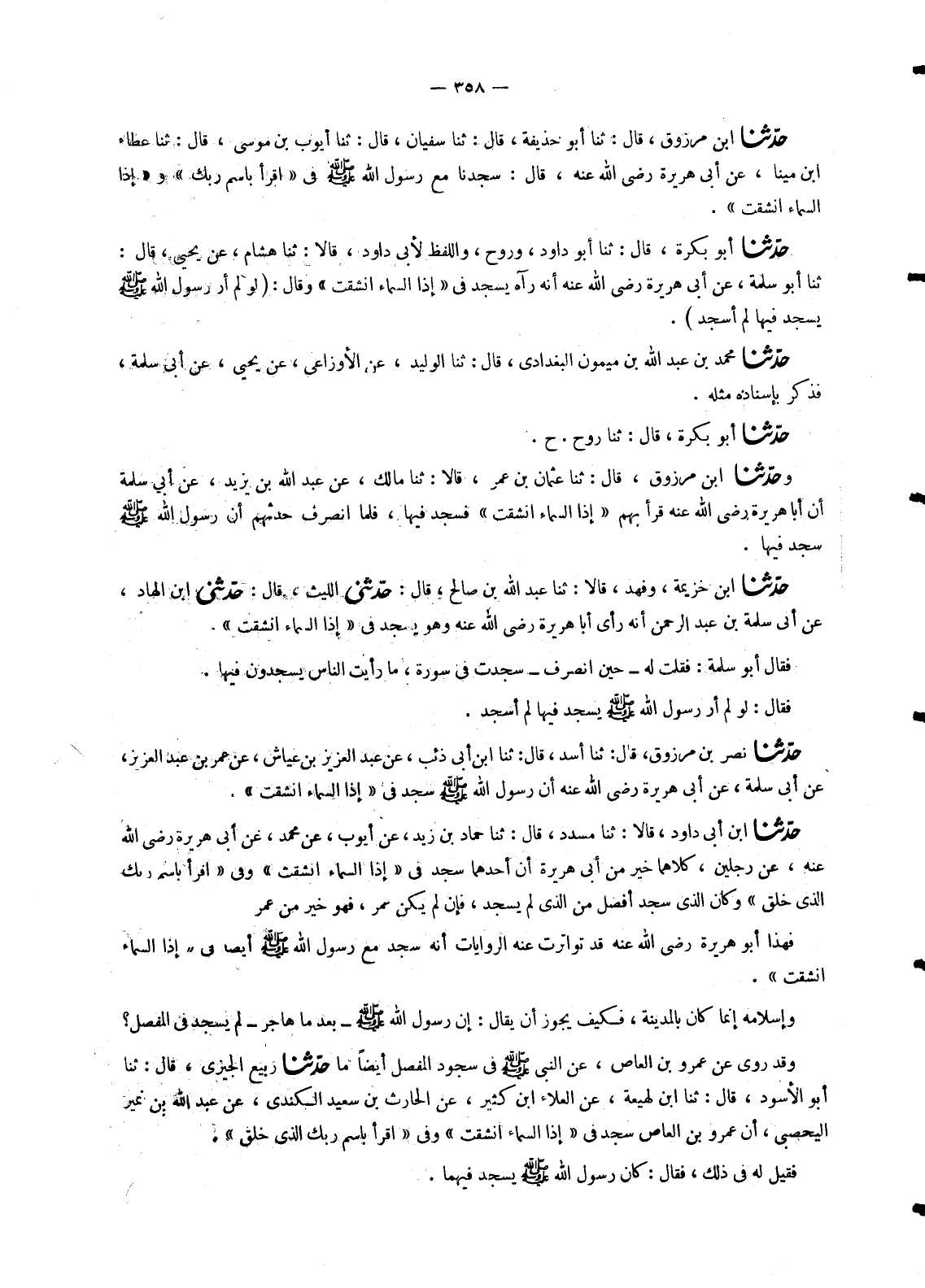 2113 - حَدَّثَنَا أَبُو بَكْرَةَ، قَالَ: ثنا أَبُو دَاوُدَ، وَرَوْحٌ , وَاللَّفْظُ لِأَبِي دَاوُدَ , قَالَا: ثنا هِشَامٌ، عَنْ يَحْيَى، قَالَ: ثنا أَبُو سَلَمَةَ، عَنْ أَبِي هُرَيْرَةَ، رَضِيَ اللهُ عَنْهُ أَنَّهُ رَآهُ §يَسْجُدُ فِي إِذَا السَّمَاءُ انْشَقَّتْ وَقَالَ: «لَوْ لَمْ أَرَ رَسُولَ اللهِ صَلَّى اللَّهُ عَلَيْهِ وَسَلَّمَ يَسْجُدُ فِيهَا لَمْ أَسْجُدْ»