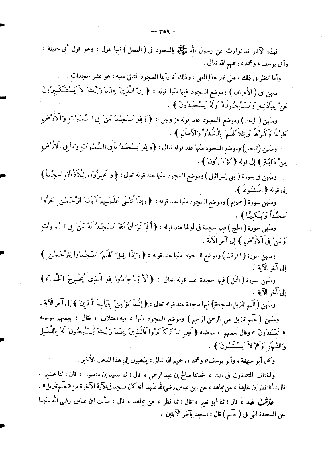 2122 - حَدَّثَنَا فَهْدٌ، قَالَ: ثنا أَبُو نُعَيْمٍ، قَالَ: ثنا فِطْرٌ، عَنْ مُجَاهِدٍ، قَالَ: سَأَلْتُ ابْنَ عَبَّاسٍ رَضِيَ اللهُ عَنْهُمَا عَنِ §السَّجْدَةِ الَّتِي، فِي حم قَالَ: «اسْجُدْ بِآخِرِ الْآيَتَيْنِ»