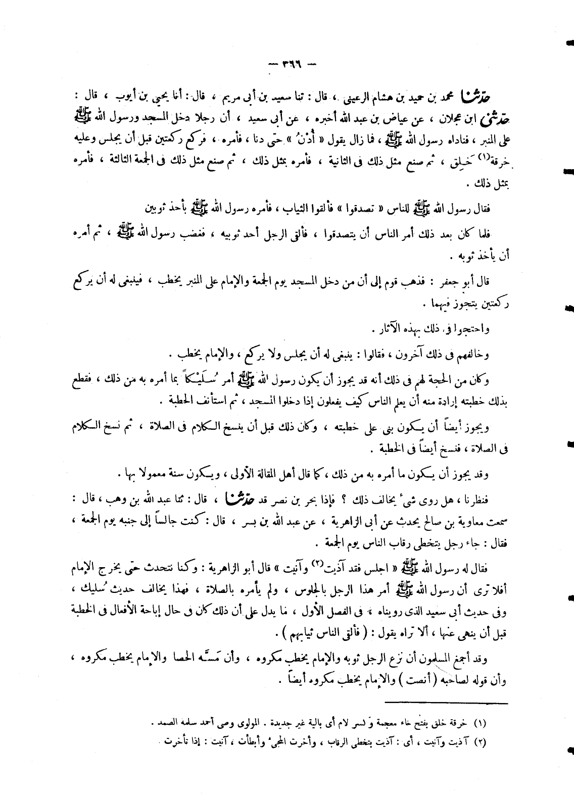 2155 - حَدَّثَنَا مُحَمَّدُ بْنُ حُمَيْدِ بْنِ هِشَامٍ الرُّعَيْنِيُّ , قَالَ: ثنا سَعِيدُ بْنُ أَبِي مَرْيَمَ , قَالَ: أنا يَحْيَى بْنُ أَيُّوبَ , قَالَ: حَدَّثَنِي ابْنُ عَجْلَانَ , عَنْ عِيَاضِ بْنِ عَبْدِ اللهِ أَخْبَرَهُ , عَنْ أَبِي سَعِيدٍ ,: أَنَّ رَجُلًا دَخَلَ الْمَسْجِدَ وَرَسُولُ اللهِ صَلَّى اللَّهُ عَلَيْهِ وَسَلَّمَ عَلَى الْمِنْبَرِ , فَنَادَاهُ رَسُولُ اللهِ صَلَّى اللَّهُ عَلَيْهِ وَسَلَّمَ , فَمَا زَالَ يَقُولُ: «ادْنُ» حَتَّى دَنَا , فَأَمَرَهُ , §فَرَكَعَ رَكْعَتَيْنِ قَبْلَ أَنْ يَجْلِسَ وَعَلَيْهِ خِرْقَةُ خَلَقٍ , ثُمَّ صَنَعَ مِثْلَ ذَلِكَ فِي الثَّانِيَةِ , فَأَمَرَهُ بِمِثْلِ ذَلِكَ , ثُمَّ صَنَعَ مِثْلَ ذَلِكَ فِي الْجُمُعَةِ الثَّالِثَةِ , فَأَمَرَهُ بِمِثْلِ ذَلِكَ. فَقَالَ رَسُولُ اللهِ صَلَّى اللَّهُ عَلَيْهِ وَسَلَّمَ لِلنَّاسِ: «تَصَدَّقُوا» فَأَلْقَوُا الثِّيَابَ , فَأَمَرَهُ رَسُولُ اللهِ صَلَّى اللَّهُ عَلَيْهِ وَسَلَّمَ بِأَخْذِ ثَوْبَيْنِ فَلَمَّا كَانَ بَعْدَ ذَلِكَ أَمَرَ النَّاسَ أَنْ يَتَصَدَّقُوا , فَأَلْقَى الرَّجُلُ أَحَدَ ثَوْبَيْهِ , فَغَضِبَ رَسُولُ اللهِ صَلَّى اللَّهُ عَلَيْهِ وَسَلَّمَ , ثُمَّ أَمَرَهُ أَنْ يَأْخُذَ ثَوْبَهُ قَالَ أَبُو جَعْفَرٍ: فَذَهَبَ قَوْمٌ إِلَى أَنَّ مَنْ دَخَلَ الْمَسْجِدَ يَوْمَ الْجُمُعَةِ وَالْإِمَامُ عَلَى الْمِنْبَرِ يَخْطُبُ , فَيَنْبَغِي لَهُ أَنْ يَرْكَعَ رَكْعَتَيْنِ يَتَجَوَّزُ فِيهِمَا. وَاحْتَجُّوا فِي ذَلِكَ بِهَذِهِ الْآثَارِ. وَخَالَفَهُمْ فِي ذَلِكَ آخَرُونَ , فَقَالُوا: يَنْبَغِي لَهُ أَنْ يَجْلِسَ وَلَا يَرْكَعُ , وَالْإِمَامُ يَخْطُبُ. وَكَانَ مِنَ الْحُجَّةِ لَهُمْ فِي ذَلِكَ أَنَّهُ قَدْ يَجُوزُ أَنْ يَكُونَ رَسُولُ اللهِ صَلَّى اللَّهُ عَلَيْهِ وَسَلَّمَ أَمَرَ سُلَيْكًا بِمَا أَمَرَهُ بِهِ مِنْ ذَلِكَ , فَقَطَعَ بِذَلِكَ خُطْبَتَهُ إِرَادَةً مِنْهُ أَنْ يُعَلِّمَ النَّاسَ كَيْفَ يَفْعَلُونَ إِذَا دَخَلُوا الْمَسْجِدَ , ثُمَّ اسْتَأْنَفَ الْخُطْبَةَ. وَيَجُوزُ أَيْضًا أَنْ يَكُونَ بَنَى عَلَى خُطْبَتِهِ , وَكَانَ ذَلِكَ قَبْلَ أَنْ يُنْسَخَ الْكَلَامُ فِي الصَّلَاةِ , ثُمَّ نُسِخَ الْكَلَامُ فِي الصَّلَاةِ , فَنُسِخَ أَيْضًا فِي الْخُطْبَةِ. وَقَدْ يَجُوزُ أَنْ يَكُونَ مَا أَمَرَهُ بِهِ مِنْ ذَلِكَ , كَمَا قَالَ أَهْلُ الْمَقَالَةِ الْأُولَى , وَيَكُونَ سُنَّةً مَعْمُولًا بِهَا. فَنَظَرْنَا , هَلْ رُوِيَ شَيْءٌ يُخَالِفُ ذَلِكَ؟