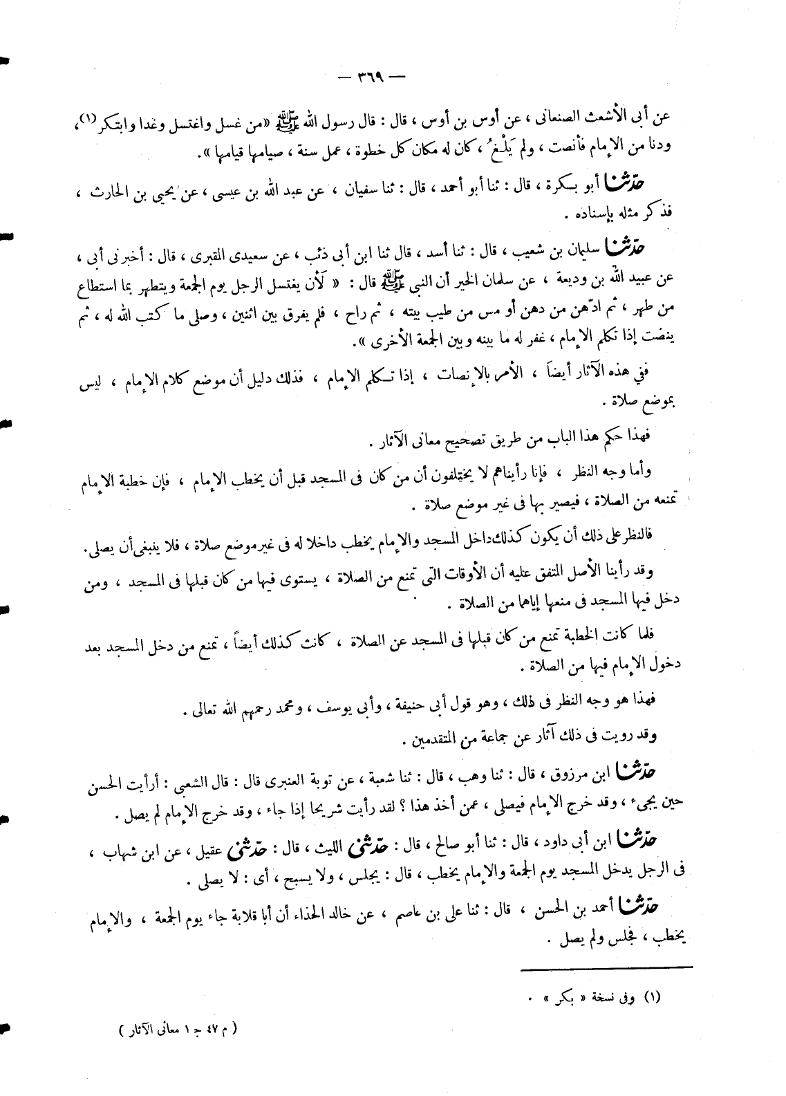 2169 - حَدَّثَنَا سُلَيْمَانُ بْنُ شُعَيْبٍ، قَالَ: ثنا أَسَدٌ، قَالَ: ثنا ابْنُ أَبِي ذِئْبٍ، عَنْ سَعِيدٍ الْمَقْبُرِيِّ، قَالَ: أَخْبَرَنِي أُبَيٌّ، عَنْ عُبَيْدِ اللهِ بْنِ وَدِيعَةَ، عَنْ سَلْمَانَ الْخَيْرِ، أَنَّ النَّبِيَّ صَلَّى اللَّهُ عَلَيْهِ وَسَلَّمَ قَالَ: «§لَأَنْ يَغْتَسِلَ الرَّجُلُ يَوْمَ الْجُمُعَةِ وَيَتَطَهَّرَ بِمَا اسْتَطَاعَ مِنْ طُهْرٍ , ثُمَّ ادَّهَنَ مِنْ دُهْنٍ أَوْ مَسَّ مِنْ طِيبِ بَيْتِهِ , ثُمَّ رَاحَ , فَلَمْ يُفَرِّقْ بَيْنَ اثْنَيْنِ , وَصَلَّى مَا كَتَبَ اللهُ لَهُ , ثُمَّ يُنْصِتُ إِذَا تَكَلَّمَ الْإِمَامُ , غُفِرَ لَهُ مَا بَيْنَهُ وَبَيْنَ الْجُمُعَةِ الْأُخْرَى» فَفِي هَذِهِ الْآثَارِ أَيْضًا , الْأَمْرُ بِالْإِنْصَاتِ , إِذَا تَكَلَّمَ الْإِمَامُ , فَذَلِكَ دَلِيلٌ أَنَّ مَوْضِعَ كَلَامِ الْإِمَامِ , لَيْسَ بِمَوْضِعِ صَلَاةٍ. فَهَذَا حُكْمُ هَذَا الْبَابِ مِنْ طَرِيقِ تَصْحِيحِ مَعَانِي الْآثَارِ. وَأَمَّا وَجْهُ النَّظَرِ , فَإِنَّا رَأَيْنَاهُمْ لَا يَخْتَلِفُونَ أَنَّ مَنْ كَانَ فِي الْمَسْجِدِ قَبْلَ أَنْ يَخْطُبَ الْإِمَامُ , فَإِنَّ خُطْبَةَ الْإِمَامِ تَمْنَعُهُ مِنَ الصَّلَاةِ , فَيَصِيرُ بِهَا فِي غَيْرِ مَوْضِعِ صَلَاةٍ. فَالنَّظَرُ عَلَى ذَلِكَ أَنْ يَكُونَ كَذَلِكَ دَاخِلَ الْمَسْجِدِ وَالْإِمَامُ يَخْطُبُ دَاخِلًا لَهُ فِي غَيْرِ مَوْضِعِ صَلَاةٍ , فَلَا يَنْبَغِي أَنْ يُصَلِّيَ. وَقَدْ رَأَيْنَا الْأَصْلَ الْمُتَّفَقَ عَلَيْهِ أَنَّ الْأَوْقَاتَ الَّتِي تَمْنَعُ مِنَ الصَّلَاةِ , يَسْتَوِي فِيهَا مَنْ كَانَ قَبْلَهَا فِي الْمَسْجِدِ , وَمَنْ دَخَلَ فِيهَا الْمَسْجِدَ فِي مَنْعِهَا إِيَّاهُمَا مِنَ الصَّلَاةِ. فَلَمَّا كَانَتِ الْخُطْبَةُ تَمْنَعُ مَنْ كَانَ قَبْلَهَا فِي الْمَسْجِدِ عَنِ الصَّلَاةِ , كَانَتْ كَذَلِكَ أَيْضًا , تَمْنَعُ مَنْ دَخَلَ الْمَسْجِدَ بَعْدَ دُخُولِ الْإِمَامِ فِيهَا مِنَ الصَّلَاةِ. فَهَذَا هُوَ وَجْهُ النَّظَرِ فِي ذَلِكَ , وَهُوَ قَوْلُ أَبِي حَنِيفَةَ وَأَبِي يُوسُفَ وَمُحَمَّدٍ رَحِمَهُمُ اللهُ تَعَالَى. وَقَدْ رُوِيَتْ فِي ذَلِكَ آثَارٌ عَنْ جَمَاعَةٍ مِنَ الْمُتَقَدِّمِينَ