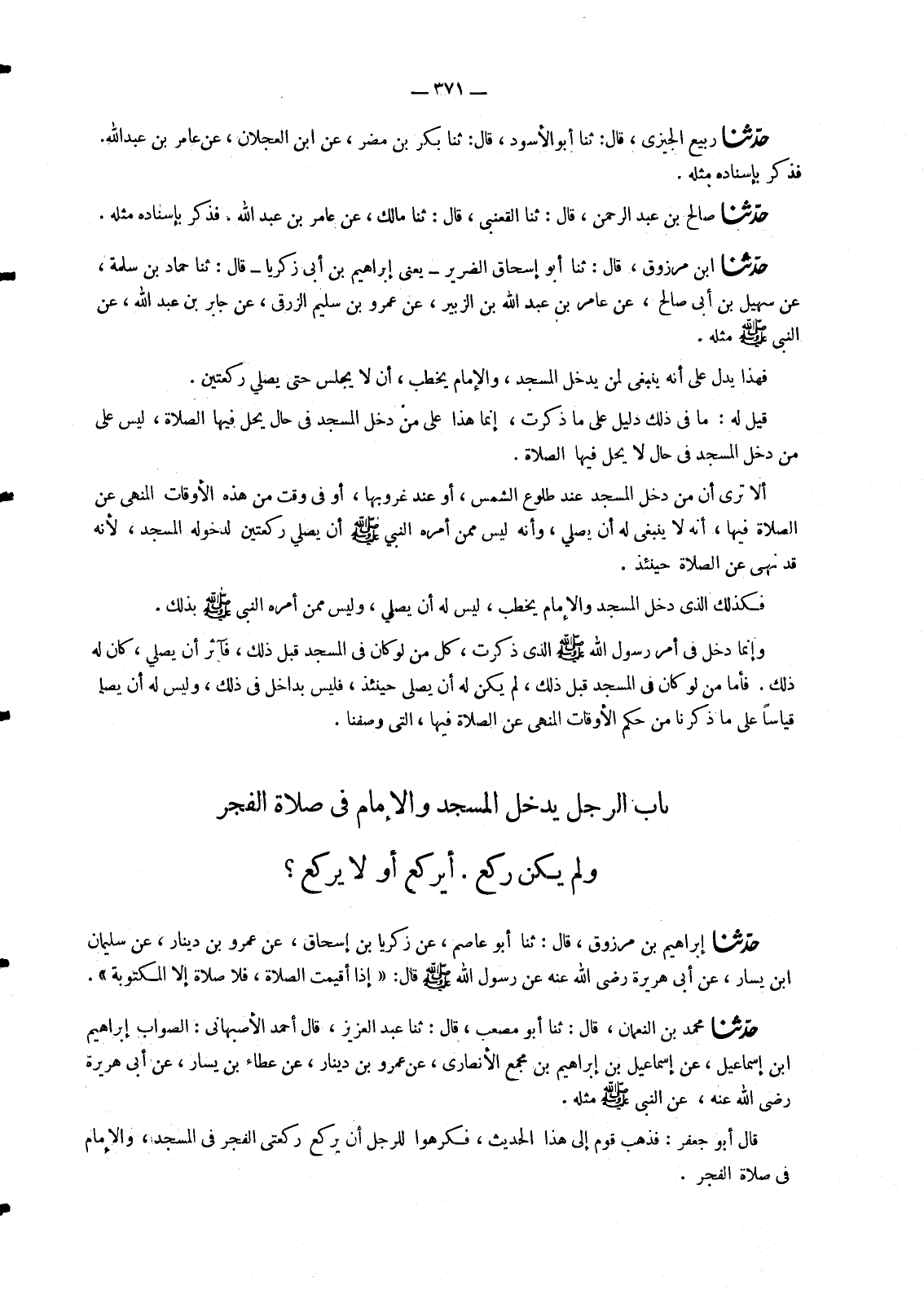 2184 - حَدَّثَنَا مُحَمَّدُ بْنُ النُّعْمَانِ، قَالَ: ثنا أَبُو مُصْعَبٍ، قَالَ: ثنا عَبْدُ الْعَزِيزِ، قَالَ أَحْمَدُ الْأَصْبَهَانِيُّ: الصَّوَابُ إِبْرَاهِيمُ بْنُ إِسْمَاعِيلَ , عَنْ إِسْمَاعِيلَ بْنِ إِبْرَاهِيمَ بْنِ مَجْمَعٍ الْأَنْصَارِيِّ , عَنْ عَمْرِو بْنِ دِينَارٍ عَنْ عَطَاءِ بْنِ يَسَارٍ , عَنْ أَبِي هُرَيْرَةَ رَضِيَ اللهُ عَنْهُ , عَنِ النَّبِيِّ صَلَّى اللَّهُ عَلَيْهِ وَسَلَّمَ مِثْلَهُ قَالَ أَبُو جَعْفَرٍ: فَذَهَبَ قَوْمٌ إِلَى هَذَا الْحَدِيثِ , فَكَرِهُوا لِلرَّجُلِ أَنْ يَرْكَعَ رَكْعَتَيِ الْفَجْرِ فِي الْمَسْجِدِ , وَالْإِمَامُ فِي صَلَاةِ الْفَجْرِ. -[372]- وَخَالَفَهُمْ فِي ذَلِكَ آخَرُونَ , فَقَالُوا: لَا بَأْسَ بِأَنْ يَرْكَعَهُمَا غَيْرُ مُخَالِطٍ لِلصُّفُوفِ , مَا لَمْ يَخَفْ فَوْتَ الرَّكْعَتَيْنِ مَعَ الْإِمَامِ. وَكَانَ مِنَ الْحُجَّةِ لَهُمْ عَلَى أَهْلِ الْمَقَالَةِ الْأُولَى , أَنَّ ذَلِكَ الْحَدِيثَ الَّذِي احْتَجُّوا بِهِ , أَصْلُهُ عَنْ أَبِي هُرَيْرَةَ رَضِيَ اللهُ عَنْهُ , لَا عَنِ النَّبِيِّ صَلَّى اللَّهُ عَلَيْهِ وَسَلَّمَ , هَكَذَا رَوَاهُ الْحُفَّاظُ , عَنْ عَمْرِو بْنِ دِينَارٍ.
