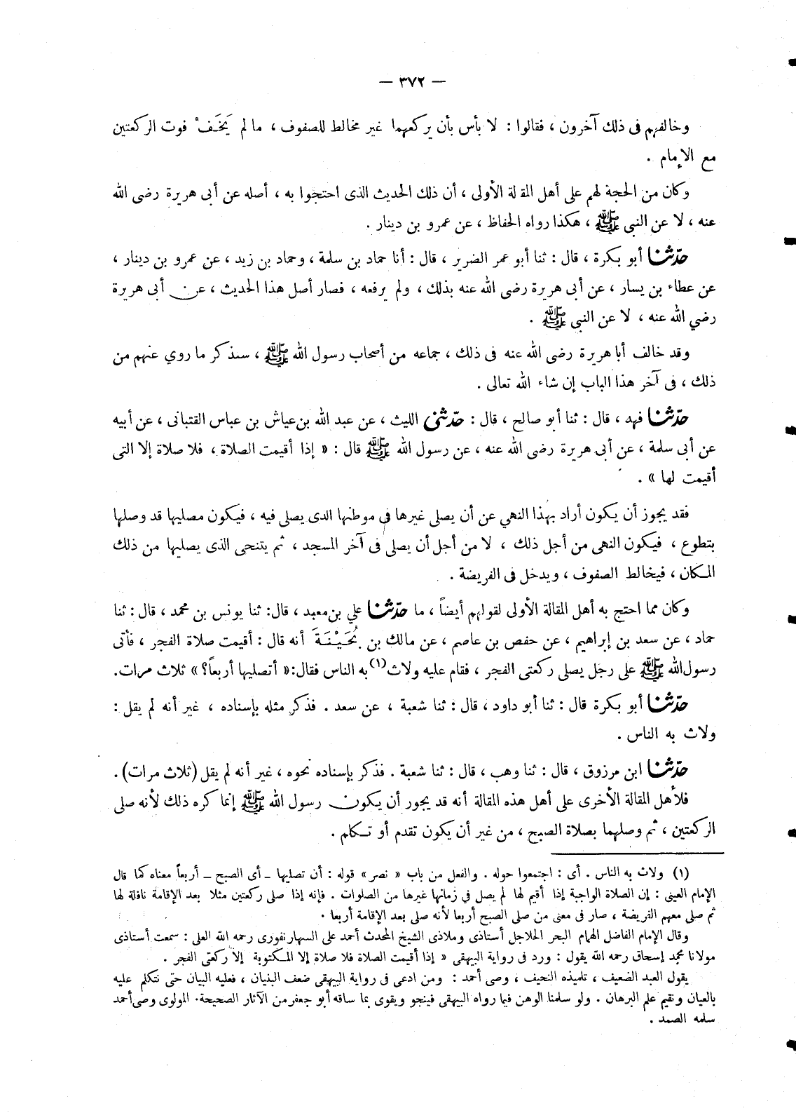 2189 - حَدَّثَنَا ابْنُ مَرْزُوقٍ , قَالَ: ثنا وَهْبٌ , قَالَ: ثنا شُعْبَةُ. فَذَكَرَ بِإِسْنَادِهِ نَحْوَهُ , غَيْرَ أَنَّهُ لَمْ يَقُلْ «ثَلَاثَ مَرَّاتٍ» فَلِأَهْلِ الْمَقَالَةِ الْأُخْرَى عَلَى أَهْلِ هَذِهِ الْمَقَالَةِ أَنَّهُ قَدْ يَجُوزُ أَنْ يَكُونَ رَسُولُ اللهِ صَلَّى اللَّهُ عَلَيْهِ وَسَلَّمَ إِنَّمَا كَرِهَ ذَلِكَ لِأَنَّهُ صَلَّى الرَّكْعَتَيْنِ , ثُمَّ وَصَلَهُمَا بِصَلَاةِ الصُّبْحِ , مِنْ غَيْرِ أَنْ يَكُونَ تَقَدَّمَ أَوْ تَكَلَّمَ. -[373]- فَإِنْ كَانَ لِذَلِكَ قَالَ لَهُ مَا قَالَ , فَإِنَّ هَذَا حَدِيثٌ يَجْتَمِعُ الْفَرِيقَانِ عَلَيْهِ جَمِيعًا. فَأَرَدْنَا أَنْ نَنْظُرَ , هَلْ رُوِيَ فِي ذَلِكَ شَيْءٌ يَدُلُّ عَلَى شَيْءٍ مِنْ ذَلِكَ؟