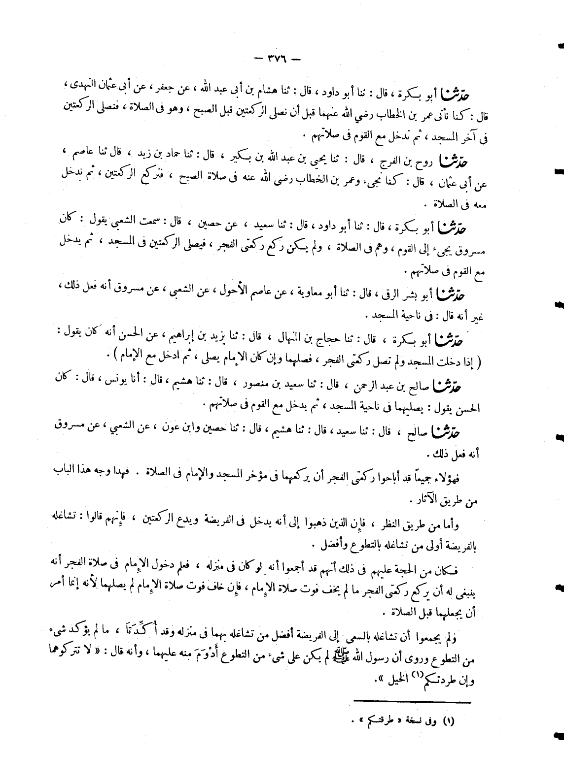 2209 - حَدَّثَنَا أَبُو بَكْرَةَ، قَالَ: ثنا أَبُو دَاوُدَ، قَالَ: ثنا سَعِيدٌ، عَنْ حُصَيْنٍ، قَالَ: سَمِعْتُ الشَّعْبِيَّ، يَقُولُ: «كَانَ مَسْرُوقٌ §يَجِيءُ إِلَى الْقَوْمِ , وَهُمْ فِي الصَّلَاةِ , وَلَمْ يَكُنْ رَكَعَ رَكْعَتَيِ الْفَجْرِ , فَيُصَلِّي الرَّكْعَتَيْنِ فِي الْمَسْجِدِ , ثُمَّ يَدْخُلُ مَعَ الْقَوْمِ فِي صَلَاتِهِمْ»