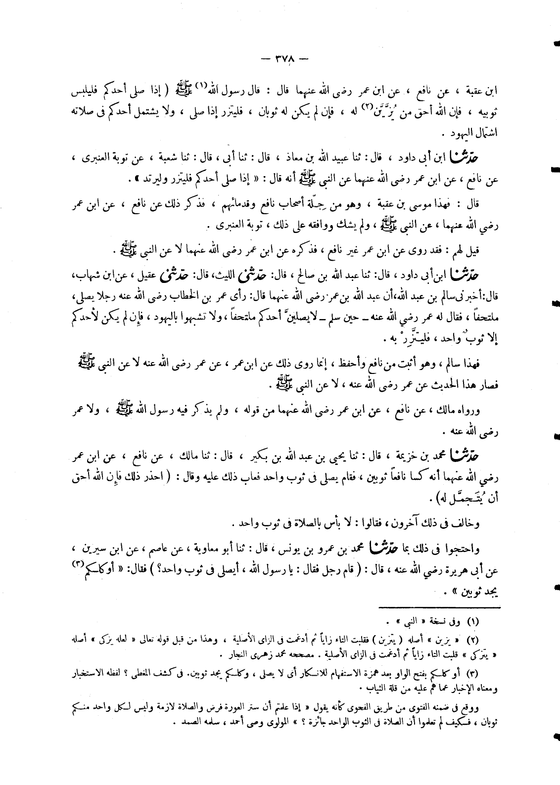 2221 - حَدَّثَنَا مُحَمَّدُ بْنُ خُزَيْمَةَ، قَالَ: ثنا يَحْيَى بْنُ عَبْدِ اللهِ بْنِ بُكَيْرٍ، قَالَ: ثنا مَالِكٌ، عَنْ نَافِعٍ، عَنِ ابْنِ عُمَرَ، رَضِيَ اللهُ عَنْهُمَا أَنَّهُ كَسَا نَافِعًا ثَوْبَيْنِ , فَقَامَ يُصَلِّي فِي ثَوْبٍ وَاحِدٍ فَعَابَ ذَلِكَ عَلَيْهِ وَقَالَ: «احْذَرْ ذَلِكَ فَإِنَّ §اللهَ أَحَقُّ أَنْ يُتَجَمَّلَ لَهُ» وَخَالَفَ فِي ذَلِكَ آخَرُونَ , فَقَالُوا: لَا بَأْسَ بِالصَّلَاةِ فِي ثَوْبٍ وَاحِدٍ