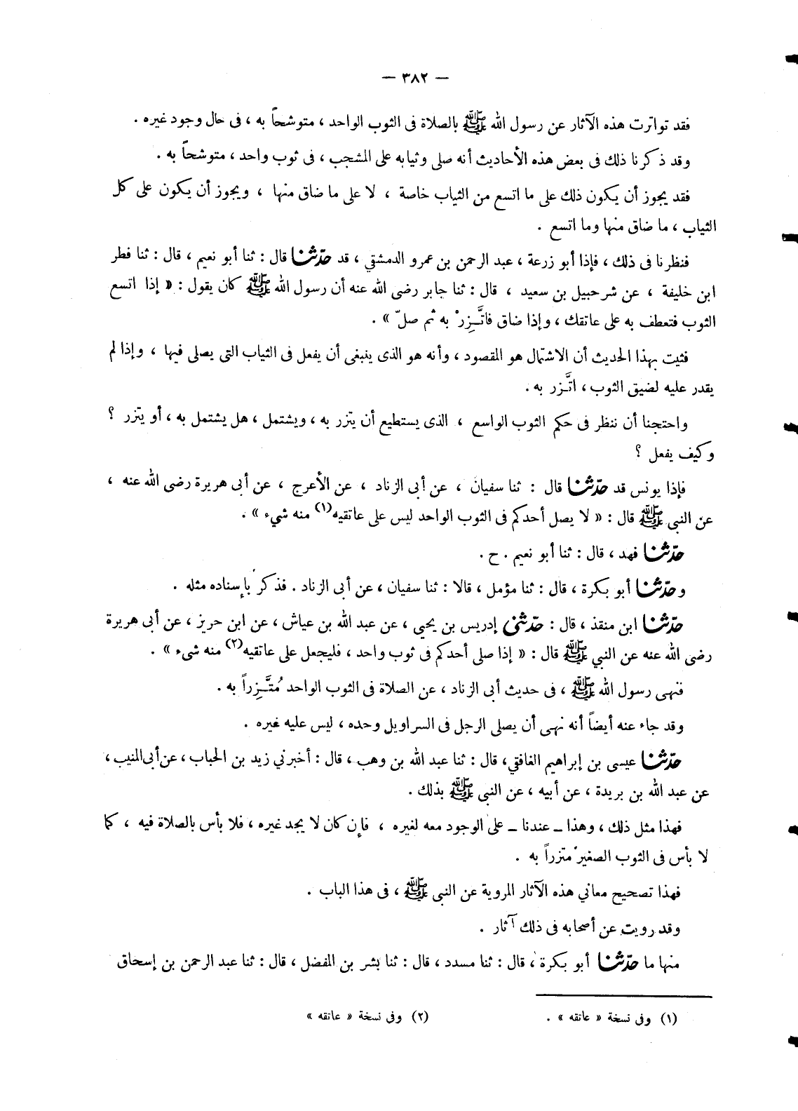 فَإِذَا أَبُو زُرْعَةَ عَبْدُ الرَّحْمَنِ بْنُ عَمْرٍو الدِّمَشْقِيُّ , قَدْ حَدَّثَنَا قَالَ: ثنا أَبُو نُعَيْمٍ , قَالَ: ثنا فِطْرُ بْنُ خَلِيفَةَ , عَنْ شُرَحْبِيلَ بْنِ سَعْدٍ قَالَ: ثنا جَابِرٌ رَضِيَ اللهُ عَنْهُ أَنَّ رَسُولَ اللهِ صَلَّى اللَّهُ عَلَيْهِ وَسَلَّمَ كَانَ يَقُولُ: «§إِذَا اتَّسَعَ الثَّوْبُ فَتَعَطَّفُ بِهِ عَلَى عَاتِقِكَ , وَإِذَا ضَاقَ فَاتَّزِرْ بِهِ ثُمَّ صَلِّ» فَثَبَتَ بِهَذَا الْحَدِيثِ أَنَّ الِاشْتِمَالَ هُوَ الْمَقْصُودُ , وَأَنَّهُ هُوَ الَّذِي يَنْبَغِي أَنْ يُفْعَلَ فِي الثِّيَابِ الَّتِي يُصَلِّي فِيهَا , وَإِذَا لَمْ يَقْدِرْ عَلَيْهِ لِضِيقِ الثَّوْبِ , اتَّزَرَ بِهِ. وَاحْتَجْنَا أَنْ نَنْظُرَ فِي حُكْمِ الثَّوْبِ الْوَاسِعِ , الَّذِي يَسْتَطِيعُ أَنْ يَتَّزِرَ بِهِ , وَيَشْتَمِلَ , هَلْ يَشْتَمِلُ بِهِ , أَوْ يَتَّزِرُ؟ وَكَيْفَ يَفْعَلُ؟