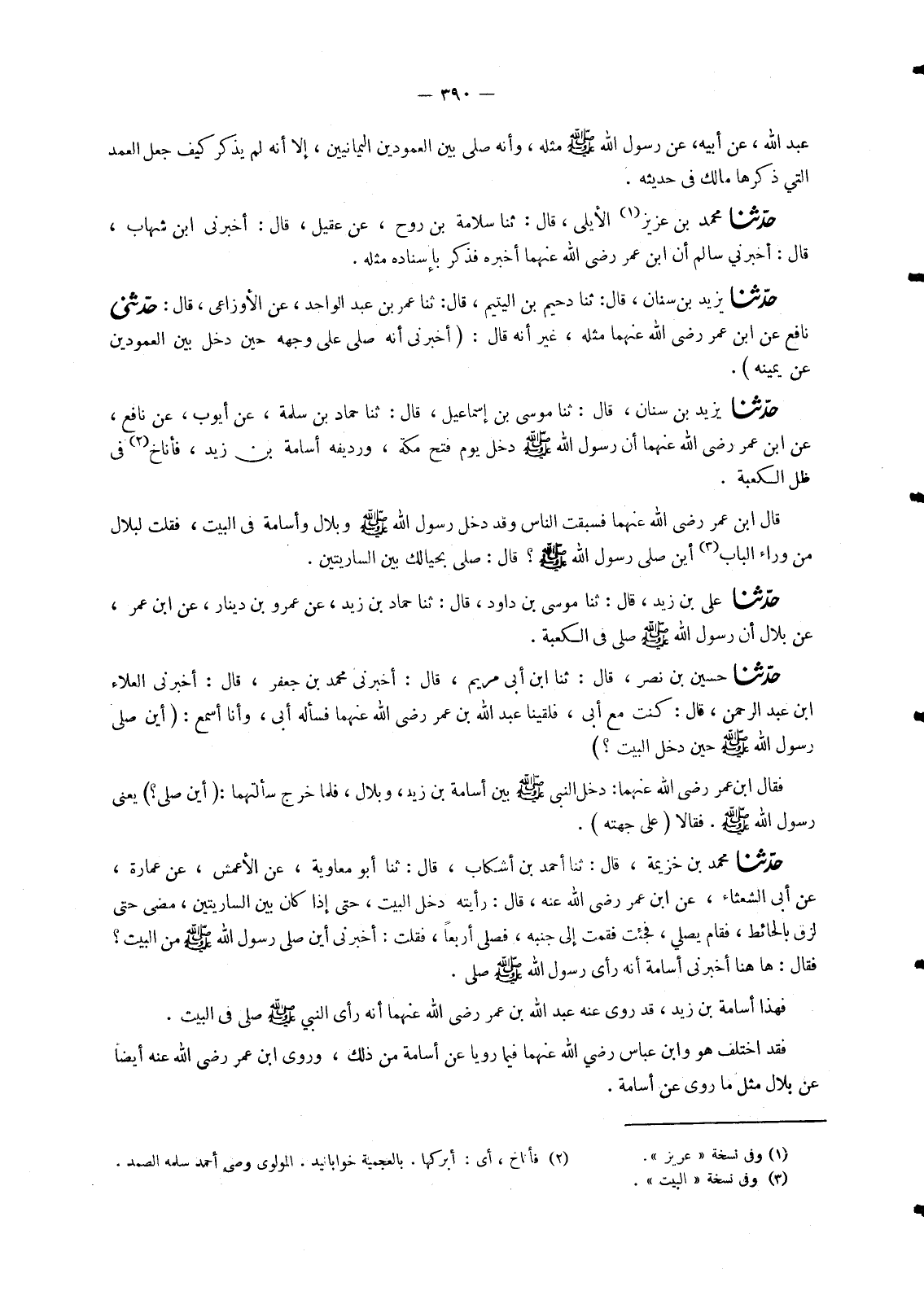 2286 - حَدَّثَنَا يَزِيدُ بْنُ سِنَانٍ، قَالَ: ثنا مُوسَى بْنُ إِسْمَاعِيلَ، قَالَ: ثنا حَمَّادُ بْنُ سَلَمَةَ، عَنْ أَيُّوبَ، عَنْ نَافِعٍ، عَنِ ابْنِ عُمَرَ، رَضِيَ اللهُ عَنْهُمَا: أَنَّ رَسُولَ اللهِ صَلَّى اللَّهُ عَلَيْهِ وَسَلَّمَ دَخَلَ يَوْمَ فَتْحِ مَكَّةَ , وَرَدِيفُهُ أُسَامَةُ بْنُ زَيْدٍ , فَأَنَاخَ فِي ظِلِّ الْكَعْبَةِ. قَالَ ابْنُ عُمَرَ رَضِيَ اللهُ عَنْهُمَا: فَسَبَقْتُ النَّاسَ وَقَدْ دَخَلَ رَسُولُ اللهِ صَلَّى اللَّهُ عَلَيْهِ وَسَلَّمَ وَبِلَالٌ وَأُسَامَةُ فِي الْبَيْتِ , فَقُلْتُ لِبِلَالٍ مِنْ وَرَاءِ الْبَابِ: أَيْنَ صَلَّى رَسُولُ اللهِ صَلَّى اللَّهُ عَلَيْهِ وَسَلَّمَ؟ قَالَ: «§صَلَّى بِحِيَالِكَ بَيْنَ السَّارِيَتَيْنِ»