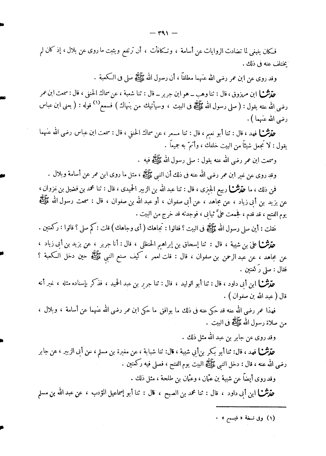 2291 - حَدَّثَنَا فَهْدٌ، قَالَ: ثنا أَبُو نُعَيْمٍ، قَالَ: ثنا مِسْعَرٌ، عَنْ سِمَاكٍ الْحَنَفِيِّ، قَالَ: سَمِعْتُ ابْنَ عَبَّاسٍ، رَضِيَ اللهُ عَنْهُمَا يَقُولُ: " §لَا تَجْعَلْ شَيْئًا مِنَ الْبَيْتِ خَلْفَكَ , وَأَتِمَّ بِهِ جَمِيعًا وَسَمِعْتُ ابْنَ عُمَرَ رَضِيَ اللهُ عَنْهُ يَقُولُ: «صَلَّى رَسُولُ اللهِ صَلَّى اللَّهُ عَلَيْهِ وَسَلَّمَ فِيهِ» وَقَدْ رُوِيَ عَنْ غَيْرِ ابْنِ عُمَرَ رَضِيَ اللهُ عَنْهُ فِي ذَلِكَ أَنَّ النَّبِيَّ صَلَّى اللَّهُ عَلَيْهِ وَسَلَّمَ , مِثْلُ مَا رَوَى ابْنُ عُمَرَ عَنْ أُسَامَةَ وَبِلَالٍ