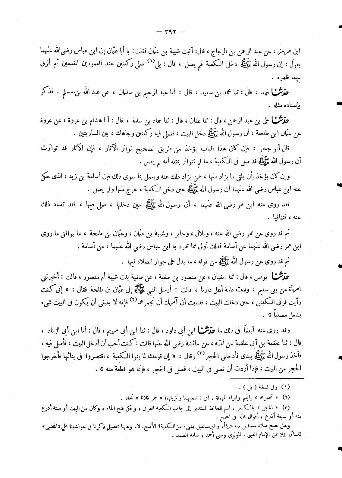 2298 - حَدَّثَنَا عَلِيُّ بْنُ عَبْدِ الرَّحْمَنِ، قَالَ: ثنا عَفَّانُ، قَالَ: ثنا حَمَّادُ بْنُ سَلَمَةَ، قَالَ: أنا هِشَامُ بْنُ عُرْوَةَ، عَنْ عُرْوَةَ، عَنْ عُثْمَانَ بْنِ طَلْحَةَ «أَنَّ رَسُولَ اللهِ صَلَّى اللَّهُ عَلَيْهِ وَسَلَّمَ §دَخَلَ الْبَيْتَ , فَصَلَّى فِيهِ رَكْعَتَيْنِ وِجَاهَكَ , بَيْنَ السَّارِيَتَيْنِ» قَالَ أَبُو جَعْفَرٍ: فَإِنْ كَانَ هَذَا الْبَابُ يُؤْخَذُ مِنْ طَرِيقِ تَصْحِيحِ تَوَاتُرِ الْآثَارِ , فَإِنَّ الْآثَارَ قَدْ تَوَاتَرَتْ أَنَّ رَسُولَ اللهِ صَلَّى اللَّهُ عَلَيْهِ وَسَلَّمَ قَدْ صَلَّى فِي الْكَعْبَةِ , مَا لَمْ تَتَوَاتَرْ بِمِثْلِهِ أَنَّهُ لَمْ يُصَلِّ. وَإِنْ كَانَ يُؤْخَذُ بِأَنْ يُلْقَى مَا يُزَادُ مِنْهَا , عَمَّنْ يُزَادُ ذَلِكَ عَنْهُ وَيُعْمَلَ بِمَا سِوَى ذَلِكَ فَإِنَّ أُسَامَةَ بْنَ زَيْدٍ , الَّذِي حَكَى عَنْهُ ابْنُ عَبَّاسٍ رَضِيَ اللهُ عَنْهُمَا أَنَّ رَسُولَ اللهِ صَلَّى اللَّهُ عَلَيْهِ وَسَلَّمَ حِينَ دَخَلَ الْكَعْبَةَ , خَرَجَ مِنْهَا وَلَمْ يُصَلِّ. فَقَدْ رَوَى عَنْهُ ابْنُ عُمَرَ رَضِيَ اللهُ عَنْهُمَا , أَنَّ رَسُولَ اللهِ صَلَّى اللَّهُ عَلَيْهِ وَسَلَّمَ حِينَ دَخَلَهَا , صَلَّى فِيهَا , فَقَدْ تَضَادَّ ذَلِكَ عَنْهُ , فَتَنَافَيَا. ثُمَّ قَدْ رُوِيَ عَنْ عُمَرَ رَضِيَ اللهُ عَنْهُ , وَبِلَالٍ , وَجَابِرٍ , وَشَيْبَةَ بْنِ عُثْمَانَ , وَعُثْمَانَ بْنِ طَلْحَةَ , مَا يُوَافِقُ مَا رَوَى ابْنُ عُمَرَ رَضِيَ اللهُ عَنْهُمَا عَنْ أُسَامَةَ فَذَلِكَ أَوْلَى مِمَّا تَفَرَّدَ بِهِ ابْنُ عَبَّاسٍ رَضِيَ اللهُ عَنْهُمَا , عَنْ أُسَامَةَ. ثُمَّ قَدْ رُوِيَ عَنْ رَسُولِ اللهِ صَلَّى اللَّهُ عَلَيْهِ وَسَلَّمَ مِنْ قَوْلِهِ , مَا يَدُلُّ عَلَى جَوَازِ الصَّلَاةِ فِيهَا