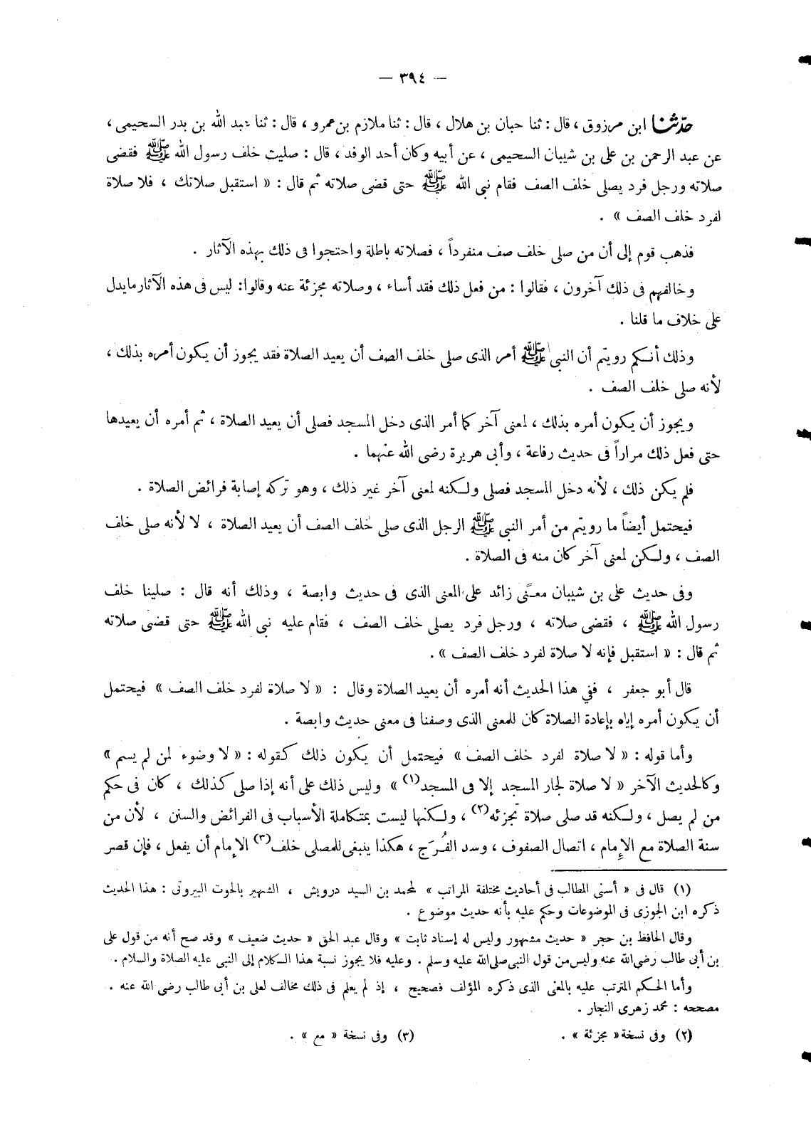 2305 - حَدَّثَنَا ابْنُ مَرْزُوقٍ , قَالَ: ثنا حَبَّانُ بْنُ هِلَالٍ , قَالَ: ثنا مُلَازِمُ بْنُ عَمْرٍو , قَالَ: ثنا عَبْدُ اللهِ بْنُ بَدْرِ السُّحَيْمِيُّ , عَنْ عَبْدِ الرَّحْمَنِ بْنِ عَلِيِّ بْنِ شَيْبَانَ السُّحَيْمِيِّ , عَنْ أَبِيهِ وَكَانَ أَحَدَ الْوَفْدِ , قَالَ: صَلَّيْتُ خَلْفَ رَسُولِ اللهِ صَلَّى اللَّهُ عَلَيْهِ وَسَلَّمَ فَقَضَى صَلَاتَهُ وَرَجُلٌ فَرْدٌ يُصَلِّي خَلْفَ الصَّفِّ فَقَامَ نَبِيُّ اللهِ صَلَّى اللَّهُ عَلَيْهِ وَسَلَّمَ حَتَّى قَضَى صَلَاتَهُ ثُمَّ قَالَ: «اسْتَقْبِلْ صَلَاتَكَ , §فَلَا صَلَاةَ لِفَرْدٍ خَلْفَ الصَّفِّ» فَذَهَبَ قَوْمٌ إِلَى أَنَّ مَنْ صَلَّى خَلْفَ صَفٍّ مُنْفَرِدًا , فَصَلَاتُهُ بَاطِلَةٌ وَاحْتَجُّوا فِي ذَلِكَ بِهَذِهِ الْآثَارِ. وَخَالَفَهُمْ فِي ذَلِكَ آخَرُونَ , فَقَالُوا: مَنْ فَعَلَ ذَلِكَ فَقَدْ أَسَاءَ , وَصَلَاتُهُ مُجْزِئَةٌ عَنْهُ وَقَالُوا: لَيْسَ فِي هَذِهِ الْآثَارِ مَا يَدُلُّ عَلَى خِلَافِ مَا قُلْنَا. وَذَلِكَ أَنَّكُمْ رَوَيْتُمْ أَنَّ النَّبِيَّ صَلَّى اللَّهُ عَلَيْهِ وَسَلَّمَ أَمَرَ الَّذِي صَلَّى خَلْفَ الصَّفِّ أَنْ يُعِيدَ الصَّلَاةَ فَقَدْ يَجُوزُ أَنْ يَكُونَ أَمَرَهُ بِذَلِكَ , لِأَنَّهُ صَلَّى خَلْفَ الصَّفِّ. وَيَجُوزُ أَنْ يَكُونَ أَمَرَهُ بِذَلِكَ , لِمَعْنًى آخَرَ كَمَا أَمَرَ الَّذِي دَخَلَ الْمَسْجِدَ فَصَلَّى أَنْ يُعِيدَ الصَّلَاةَ , ثُمَّ أَمَرَهُ أَنْ يُعِيدَهَا حَتَّى فَعَلَ ذَلِكَ مِرَارًا فِي حَدِيثِ رِفَاعَةَ , وَأَبِي هُرَيْرَةَ رَضِيَ اللهُ عَنْهُمَا. فَلَمْ يَكُنْ ذَلِكَ , لِأَنَّهُ دَخَلَ الْمَسْجِدَ فَصَلَّى وَلَكِنَّهُ لِمَعْنًى آخَرَ غَيْرَ ذَلِكَ , وَهُوَ تَرْكُهُ إِصَابَةَ فَرَائِضِ الصَّلَاةِ. فَيَحْتَمِلُ أَيْضًا مَا رَوَيْتُمْ مِنْ أَمْرِ النَّبِيِّ صَلَّى اللَّهُ عَلَيْهِ وَسَلَّمَ الرَّجُلَ الَّذِي صَلَّى خَلْفَ الصَّفِّ أَنْ يُعِيدَ الصَّلَاةَ , لَا لِأَنَّهُ صَلَّى خَلْفَ الصَّفِّ , وَلَكِنْ لِمَعْنًى آخَرَ كَانَ مِنْهُ فِي الصَّلَاةِ. وَفِي حَدِيثِ عَلِيِّ بْنِ شَيْبَانَ مَعْنًى زَائِدٌ عَلَى الْمَعْنَى الَّذِي فِي حَدِيثِ وَابِصَةَ , وَذَلِكَ أَنَّهُ قَالَ: صَلَّيْنَا خَلْفَ رَسُولِ اللهِ صَلَّى اللَّهُ عَلَيْهِ وَسَلَّمَ فَقَضَى صَلَاتَهُ , وَرَجُلٌ فَرْدٌ يُصَلِّي خَلْفَ الصَّفِّ , فَقَامَ عَلَيْهِ نَبِيُّ اللهِ صَلَّى اللَّهُ عَلَيْهِ وَسَلَّمَ حَتَّى قَضَى صَلَاتَهُ ثُمَّ قَالَ: «اسْتَقْبِلْ فَإِنَّهُ لَا صَلَاةَ لِفَرْدٍ خَلْفَ الصَّفِّ» , قَالَ أَبُو جَعْفَرٍ: فَفِي هَذَا الْحَدِيثِ أَنَّهُ أَمَرَهُ أَنْ يُعِيدَ الصَّلَاةَ وَقَالَ: «لَا صَلَاةَ لِفَرْدٍ خَلْفَ الصَّفِّ» فَيَحْتَمِلُ أَنْ يَكُونَ أَمْرُهُ إِيَّاهُ بِإِعَادَةِ الصَّلَاةِ كَانَ لِلْمَعْنَى الَّذِي وَصَفْنَا فِي مَعْنَى حَدِيثِ وَابِصَةَ. وَأَمَّا قَوْلُهُ: «لَا صَلَاةَ لِفَرْدٍ خَلْفَ الصَّفِّ» فَيَحْتَمِلُ أَنْ يَكُونَ ذَلِكَ كَقَوْلِهِ: «لَا وُضُوءَ لِمَنْ لَمْ يُسَمِّ» وَكَالْحَدِيثِ الْآخَرِ «لَا صَلَاةَ لِجَارِ الْمَسْجِدِ إِلَّا فِي الْمَسْجِدِ» وَلَيْسَ ذَلِكَ عَلَى أَنَّهُ إِذَا صَلَّى كَذَلِكَ , كَانَ فِي حُكْمِ مَنْ لَمْ يُصَلِّ , وَلَكِنَّهُ قَدْ صَلَّى صَلَاةً تُجْزِئُهُ , وَلَكِنَّهَا لَيْسَتْ بِمُتَكَامِلَةِ الْأَسْبَابِ فِي الْفَرَائِضِ وَالسُّنَنِ , لِأَنَّ مِنْ سُنَّةِ الصَّلَاةِ مَعَ الْإِمَامِ , اتِّصَالُ الصُّفُوفِ , وَسَدُّ الْفُرَجِ , هَكَذَا يَنْبَغِي لِلْمُصَلِّي خَلْفَ الْإِمَامِ أَنْ يَفْعَلَ , فَإِنْ قَصَّرَ -[395]- عَنْ ذَلِكَ فَقَدْ أَسَاءَ وَصَلَاتُهُ تُجْزِئُهُ وَلَكِنَّهَا لَيْسَتْ بِالصَّلَاةِ الْمُتَكَامِلَةِ فِي فَرَائِضِهَا وَسُنَنِهَا , فَقِيلَ لِذَلِكَ لَا صَلَاةَ 