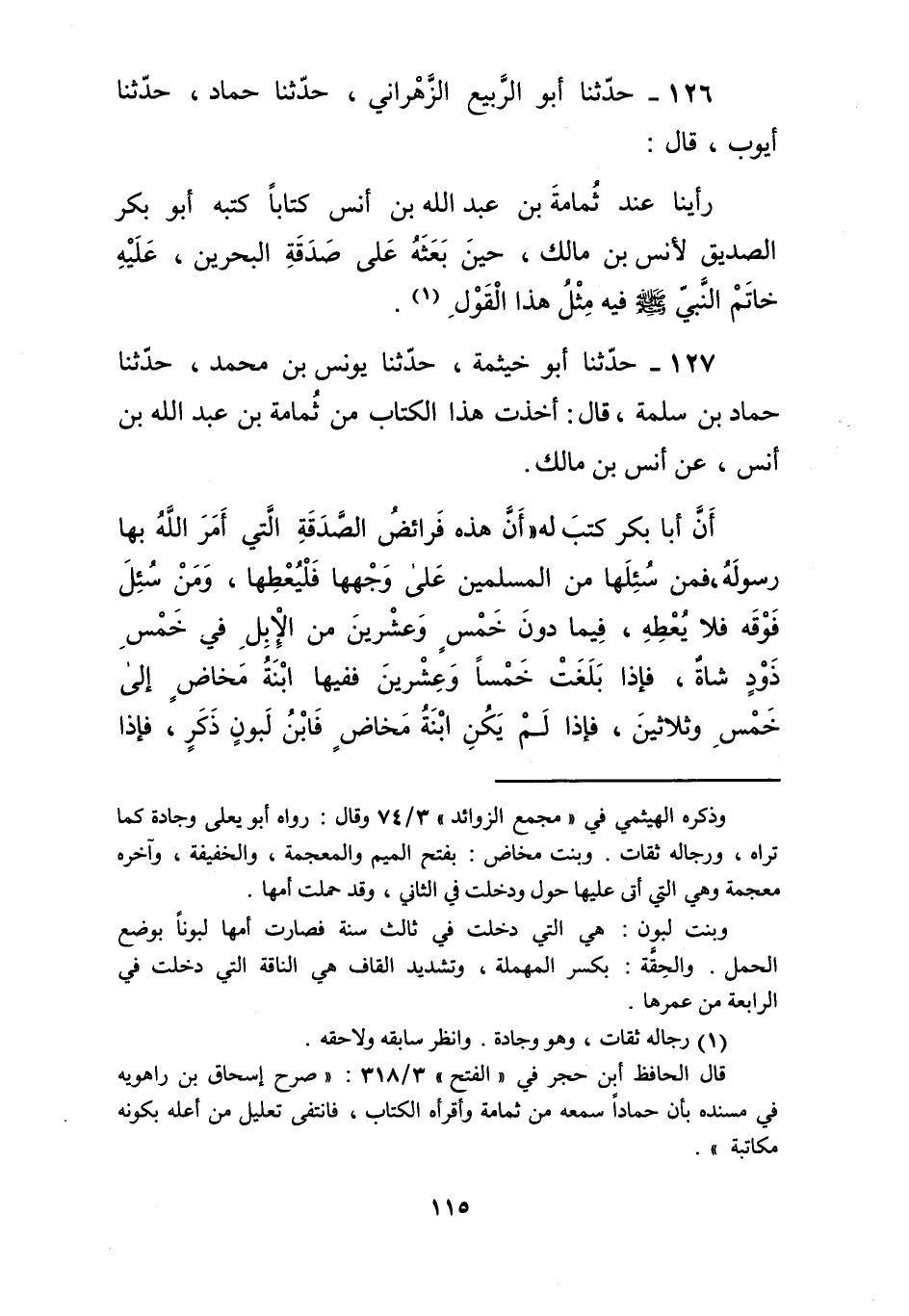 127 - حَدَّثَنَا أَبُو خَيْثَمَةَ، حَدَّثَنَا يُونُسُ بْنُ مُحَمَّدٍ، حَدَّثَنَا حَمَّادُ بْنُ سَلَمَةَ، قَالَ: أَخَذْتُ هَذَا الْكِتَابَ مِنْ ثُمَامَةَ بْنِ عَبْدِ اللَّهِ بْنِ أَنَسٍ، عَنْ أَنَسِ بْنِ مَالِكٍ، أَنَّ أَبَا بَكْرٍ، كَتَبَ لَهُ: إِنَّ هَذِهِ فَرَائِضُ الصَّدَقَةِ الَّتِي أَمْرَ اللَّهُ بِهَا رَسُولَهُ، فَمَنْ سُئِلَهَا مِنَ الْمُسْلِمِينَ عَلَى وَجْهِهَا فَلْيُعْطِهَا، وَمَنْ سُئِلَ فَوْقَهُ فَلَا يُعْطِهِ، §فِيمَا دُونَ خَمْسٍ وَعِشْرِينَ مِنَ الْإِبِلِ فِي خَمْسِ ذَوْدٍ شَاةٌ، فَإِذَا بَلَغَتْ خَمْسًا وَعِشْرِينَ فَفِيهَا ابْنَةُ مَخَاضٍ إِلَى خَمْسٍ وَثَلَاثِينَ، فَإِذَا لَمْ يَكُنِ ابْنَةُ مَخَاضٍ فَابْنُ لَبُونٍ ذَكَرٌ، فَإِذَا -[116]- بَلَغَتْ سِتًّا وَثَلَاثِينَ فَفِيهَا ابْنَةُ لَبُونٍ إِلَى خَمْسٍ وَأَرْبَعِينَ، فَإِذَا بَلَغَتْ سِتًّا وَأَرْبَعِينَ فَفِيهَا حِقَّةٌ طَرُوقَةُ الْفَحْلِ إِلَى سِتِّينَ، فَإِذَا بَلَغَتْ وَاحِدًا وَسِتِّينَ فَفِيهَا جَذَعَةٌ إِلَى خَمْسٍ وَسَبْعِينَ، فَإِذَا بَلَغَتْ سِتَّةً وَسَبْعِينَ فَفِيهَا ابْنَتَا لَبُونٍ إِلَى تِسْعِينَ، فَإِذَا بَلَغَتْ وَاحِدًا وَتِسْعِينَ فَفِيهَا حِقَّتَانِ طَرُوقَتَا الْفَحْلِ، إِلَى عِشْرِينَ وَمِائَةٍ، فَإِذَا زَادَتْ عَلَى عِشْرِينَ وَمِائَةٍ فَفِي كُلِّ أَرْبَعِينَ بِنْتُ لَبُونٍ، وَفِي كُلِّ خَمْسِينَ حِقَّةٌ، فَإِذَا تَبَايَنَ أَسْنَانُ الْإِبِلِ فِي الْفَرَائِضِ الصَّدَقَاتُ، فَمَنْ بَلَغَتْ عِنْدَهُ صَدَقَةُ الْجَذَعَةِ وَلَيْسَتْ عِنْدَهُ جَذَعَةٌ، وَعِنْدَهُ حِقَّةٌ فَإِنَّهَا تُقْبَلُ مِنْهُ الْحِقَّةُ وَيَجْعَلُ مَعَهَا شَاتَانِ إِنِ اسْتَيْسَرَتَا لَهُ، أَوْ عِشْرِينَ دِرْهَمًا، وَمَنْ بَلَغَتْ عِنْدَهُ صَدَقَةُ الْحِقَّةِ، وَلَيْسَ عِنْدَهُ إِلَّا جَذَعَةٌ، فَإِنَّهَا تُقْبَلُ مِنْهُ وَيُعْطِيهِ الْمُصَّدِّقُ عِشْرِينَ دِرْهَمًا أَوْ شَاتَيْنِ، وَمَنْ بَلَغَتْ عِنْدَهُ صَدَقَةُ الْحِقَّةِ، وَلَيْسَتْ عِنْدَهُ، وَعِنْدَهُ ابْنَةُ لَبُونٍ فَإِنَّهَا تُقْبَلُ مِنْهُ وَيَجْعَلُ مَعَهَا شَاتَيْنِ إِنِ اسْتَيْسَرَتَا أَوْ عِشْرِينَ دِرْهَمًا، وَمَنْ بَلَغَتْ صَدَقَتُهُ ابْنَةَ لَبُونٍ، وَلَيْسَتْ عِنْدَهُ إِلَّا حِقَّةٌ، فَإِنَّهَا تُقْبَلُ مِنْهُ وَيُعْطِيهِ الْمُصَّدِّقُ عِشْرِينَ دِرْهَمًا أَوْ شَاتَيْنِ، وَمَنْ بَلَغَتْ صَدَقَتُهُ ابْنَةَ لَبُونٍ، وَلَيْسَتْ عِنْدَهُ ابْنَةَ لَبُونٍ، وَعِنْدَهُ ابْنَةُ مَخَاضٍ، فَإِنَّهَا تُقْبَلُ مِنْهُ وَيَجْعَلُ مَعَهَا شَاتَيْنِ إِنِ اسْتَيْسَرَتَا، أَوْ عِشْرِينَ دِرْهَمًا، وَمَنْ بَلَغَتْ صَدَقَتُهُ ابْنَةَ مَخَاضٍ، وَلَيْسَ عِنْدَهُ إِلَّا ابْنُ لَبُونٍ ذَكَرٌ، فَإِنَّهُ يُقْبَلُ مِنْهُ وَلَيْسَ مَعَهُ شَيْءٌ، وَمَنْ لَمْ يَكُنْ عِنْدَهُ إِلَّا أَرْبَعَةٌ مِنَ الْإِبِلِ فَلَيْسَ فِيهَا شَيْءٌ إِلَّا أَنْ يَشَاءَ رَبُّهَا، وَفِي صَدَقَةِ الْغَنَمِ فِي سَائِمَتِهَا، إِذَا كَانَتْ أَرْبَعِينَ، فَفِيهَا شَاةٌ إِلَى عِشْرِينَ وَمِائَةٍ، فَإِذَا زَادَتْ فَفِيهَا شَاتَانِ إِلَى مِائَتَيْنِ، فَإِذَا زَادَتْ فَفِيهَا ثَلَاثُ شِيَاهٍ إِلَى -[117]- ثَلَاثِ مِائَةٍ، فَإِذَا زَادَتْ وَاحِدَةٌ فَفِي كُلِّ مِائَةٍ شَاةٌ، وَلَا تُؤْخَذُ فِي الصَّدَقَةِ هَرِمَةٌ، وَلَا ذَاتُ عَوَارٍ وَلَا تَيْسُ الْغَنَمِ، إِلَّا أَنْ يَشَاءَ الْمُصَّدِّقُ، وَلَا يَجْمَعُ بَيْنَ مُتَفَرِّقٍ، وَلَا يُفَرِّقُ بَيْنَ مُجْتَمِعٍ خَشْيَةَ الصَّدَقَةِ، وَمَا كَانَ مِنْ خَلِيطَيْنِ فَإِنَّهُمَا يَتَرَاجَعَانِ بَيْنَهُمَا بِالسَّوِيَّةِ إِذَا كَانَتْ سَائِمَةُ الرَّجُلِ نَاقِصَةً مِنَ الْأَرْبَعِينَ شَاةً وَاحِدَةً فَلَيْسَ فِيهَا إِلَّا أَن