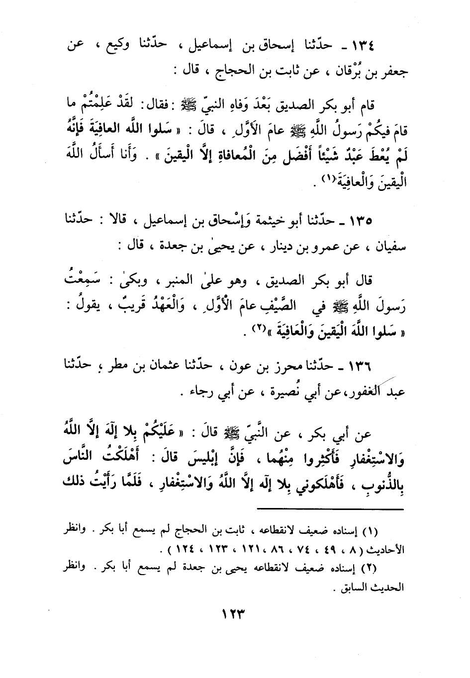 135 - حَدَّثَنَا أَبُو خَيْثَمَةَ، وَإِسْحَاقُ بْنُ إِسْمَاعِيلَ، قَالَا: حَدَّثَنَا سُفْيَانُ، عَنْ عَمْرِو بْنِ دِينَارٍ، عَنْ يَحْيَى بْنِ جَعْدَةَ، قَالَ: قَالَ أَبُو بَكْرٍ الصِّدِّيقُ، وَهُوَ عَلَى الْمِنْبَرِ، وَبَكَى: سَمِعْتُ رَسُولَ اللَّهِ صَلَّى اللهُ عَلَيْهِ وَسَلَّمَ فِي الصَّيْفِ عَامَ الْأَوَّلِ، وَالْعَهْدُ قَرِيبٌ، يَقُولُ: «§سَلُوا اللَّهَ الْيَقِينَ وَالْعَافِيَةَ» Kإسناده ضعيف لانقطاعه