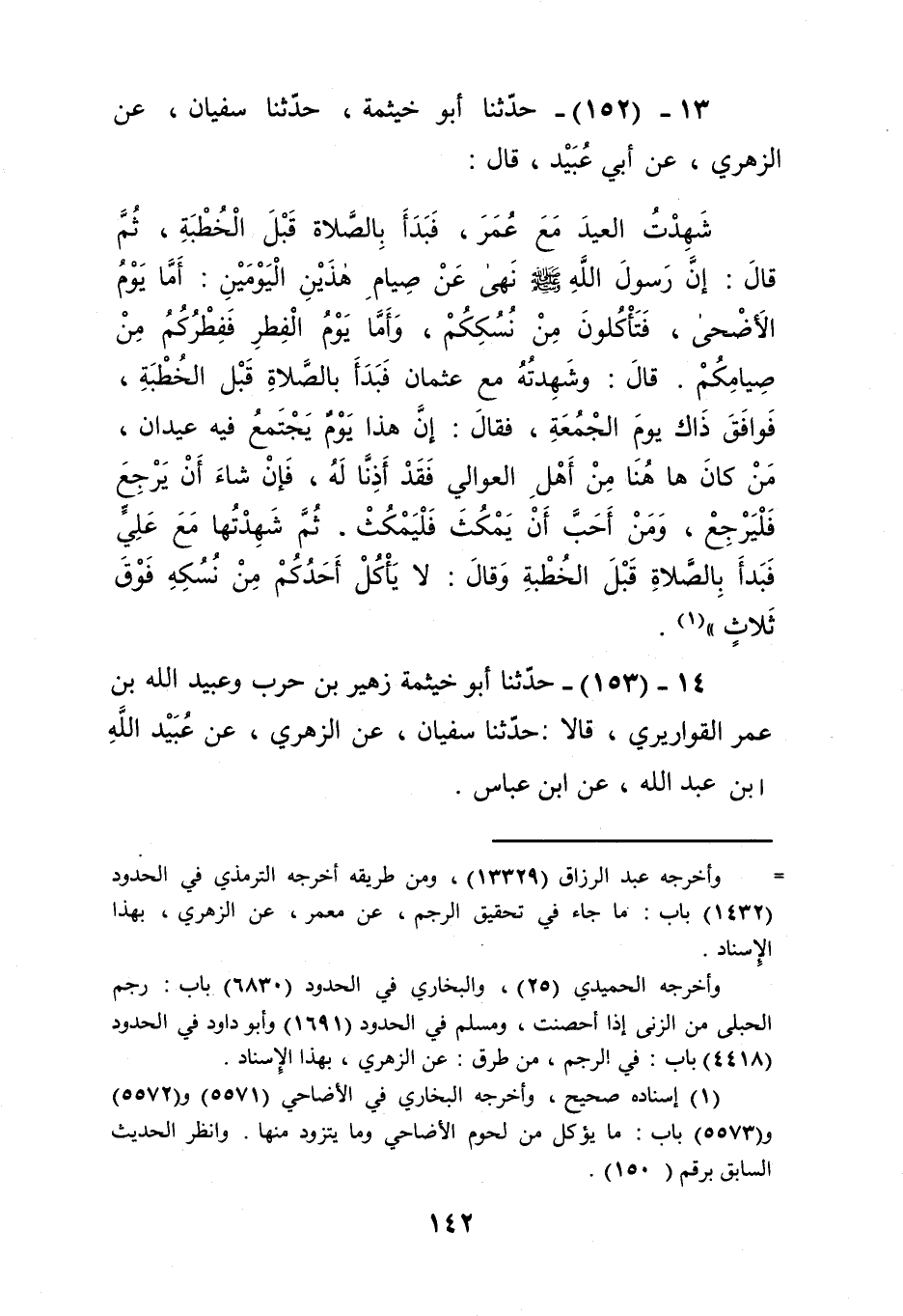 152 - حَدَّثَنَا أَبُو خَيْثَمَةَ، حَدَّثَنَا سُفْيَانُ، عَنِ الزُّهْرِيِّ، عَنْ أَبِي عُبَيْدٍ، قَالَ: شَهِدْتُ الْعِيدَ مَعَ عُمَرَ، فَبَدَأَ بِالصَّلَاةِ قَبْلَ الْخُطْبَةِ، ثُمَّ قَالَ: إِنَّ رَسُولَ اللَّهِ صَلَّى اللهُ عَلَيْهِ وَسَلَّمَ §نَهَى عَنْ صِيَامِ هَذَيْنِ الْيَوْمَيْنِ: «أَمَّا يَوْمُ الْأَضْحَى، فَتَأْكُلُونَ مِنْ نُسُكِكُمْ، وَأَمَّا يَوْمُ الْفِطْرِ فَفِطْرُكُمْ مِنْ صِيَامِكُمْ». قَالَ: وَشَهِدْتُهُ مَعَ عُثْمَانَ، فَبَدَأَ بِالصَّلَاةِ قَبْلَ الْخُطْبَةِ، فَوَافَقَ ذَاكَ يَوْمَ الْجُمُعَةِ، فَقَالَ: «إِنَّ هَذَا يَوْمٌ يَجْتَمِعُ فِيهِ عِيدَانِ، مَنْ كَانَ هَاهُنَا مِنْ أَهْلِ الْعَوَالِي فَقَدْ أَذِنَّا لَهُ، فَإِنْ شَاءَ أَنْ يَرْجِعَ فَلْيَرْجِعْ، وَمَنْ أَحَبَّ أَنْ يَمْكُثَ فَلْيَمْكُثْ» ثُمَّ شَهِدْتُهَا مَعَ عَلِيٍّ، فَبَدَأَ بِالصَّلَاةِ قَبْلَ الْخُطْبَةِ، وَقَالَ: «لَا يَأْكُلْ أَحَدُكُمْ مِنْ نُسُكِهِ فَوْقَ ثَلَاثٍ» Kإسناده صحيح