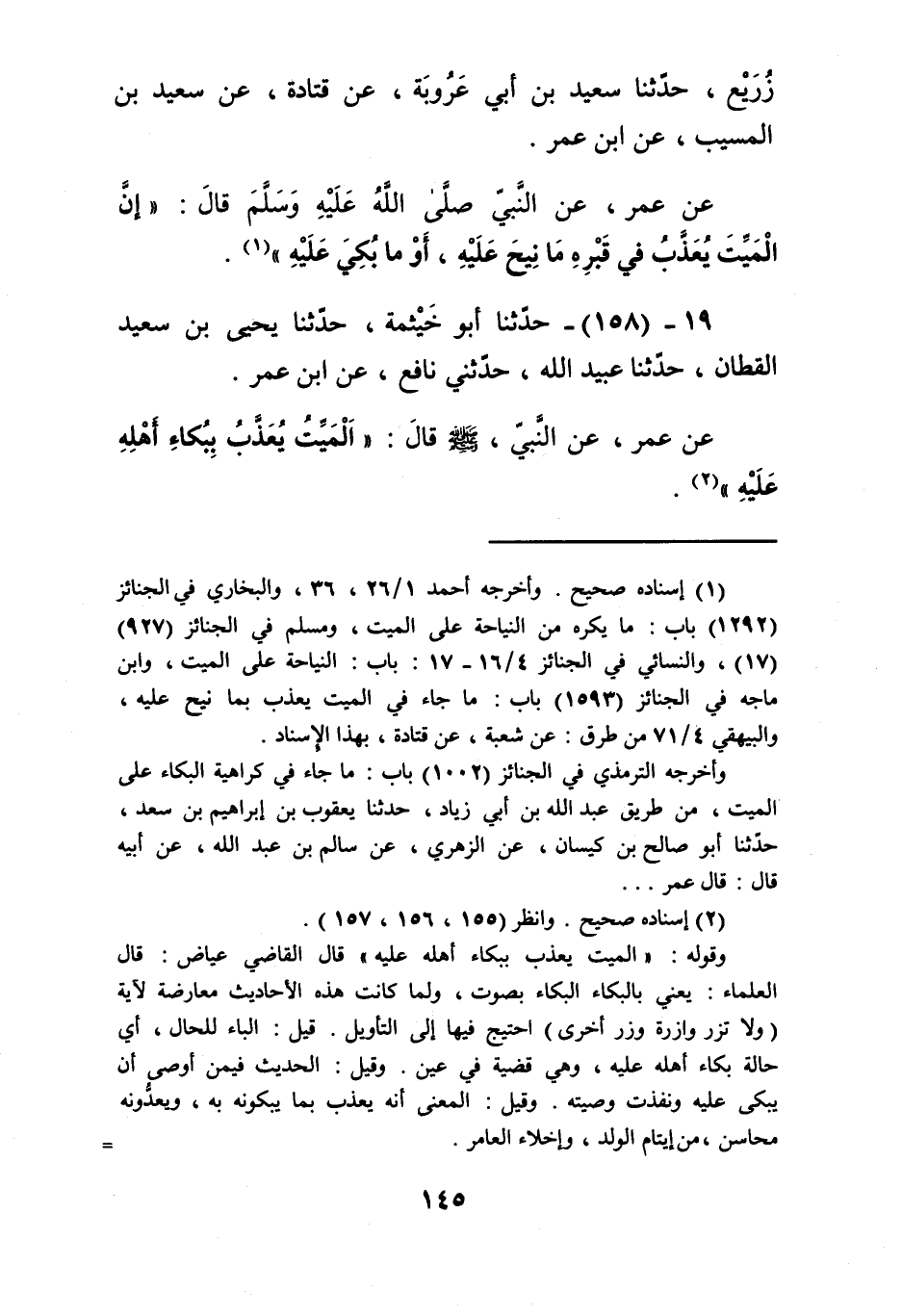 158 - حَدَّثَنَا أَبُو خَيْثَمَةَ، حَدَّثَنَا يَحْيَى بْنُ سَعِيدٍ الْقَطَّانُ، حَدَّثَنَا عُبَيْدُ اللَّهِ، حَدَّثَنِي نَافِعٌ، عَنِ ابْنِ عُمَرَ، عَنْ عُمَرَ، عَنِ النَّبِيِّ صَلَّى اللهُ عَلَيْهِ وَسَلَّمَ قَالَ: «§الْمَيِّتُ يُعَذَّبُ بِبُكَاءِ أَهْلِهِ عَلَيْهِ» Kإسناده صحيح