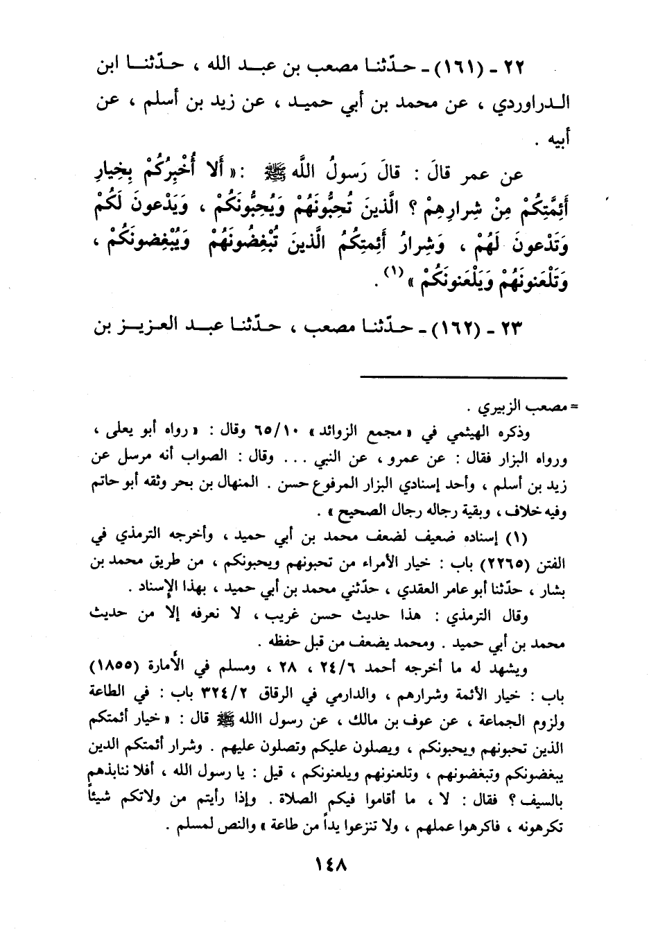 161 - حَدَّثَنَا مُصْعَبُ بْنُ عَبْدِ اللَّهِ، حَدَّثَنَا ابْنُ الدَّرَاوَرْدِيِّ، عَنْ مُحَمَّدِ بْنِ أَبِي حُمَيْدٍ، عَنْ زَيْدِ بْنِ أَسْلَمَ، عَنْ أَبِيهِ، عَنْ عُمَرَ، قَالَ: قَالَ رَسُولُ اللَّهِ صَلَّى اللهُ عَلَيْهِ وَسَلَّمَ: «§أَلَا أُخْبِرُكُمْ بِخِيَارِ أَئِمَّتِكُمْ مِنْ شِرَارِهِمْ؟ الَّذِينَ تُحِبُّونَهُمْ وَيُحِبُّونَكُمْ، وَيَدْعُونَ لَكُمْ وَتَدْعُونَ لَهُمْ، وَشِرَارُ أَئِمَّتِكُمُ الَّذِينَ تُبْغِضُونَهُمْ وَيُبْغِضُونَكُمْ، وَتَلْعَنُونَهُمْ وَيَلْعَنُونَكُمْ» Kإسناده ضعيف