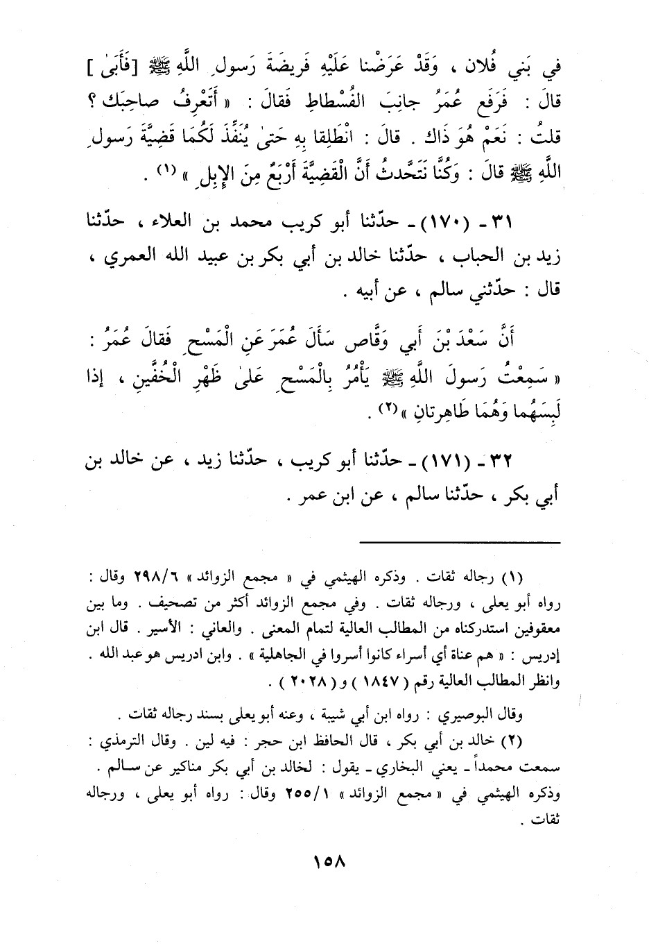 170 - حَدَّثَنَا أَبُو كُرَيْبٍ مُحَمَّدُ بْنُ الْعَلَاءِ، حَدَّثَنَا زَيْدُ بْنُ الْحُبَابِ، حَدَّثَنَا خَالِدُ بْنُ أَبِي بَكْرِ بْنِ عُبَيْدِ اللَّهِ الْعُمَرِيُّ، قَالَ: حَدَّثَنِي سَالِمٌ، عَنْ أَبِيهِ، أَنَّ سَعْدَ بْنَ أَبِي وَقَّاصٍ سَأَلَ عُمَرَ عَنِ الْمَسْحِ، فَقَالَ عُمَرُ: سَمِعْتُ رَسُولَ اللَّهِ صَلَّى اللهُ عَلَيْهِ وَسَلَّمَ §يَأْمُرُ بِالْمَسْحِ عَلَى ظَهَرِ الْخُفَّيْنِ إِذَا لَبِسَهُمَا وَهُمَا طَاهِرَتَانِ "