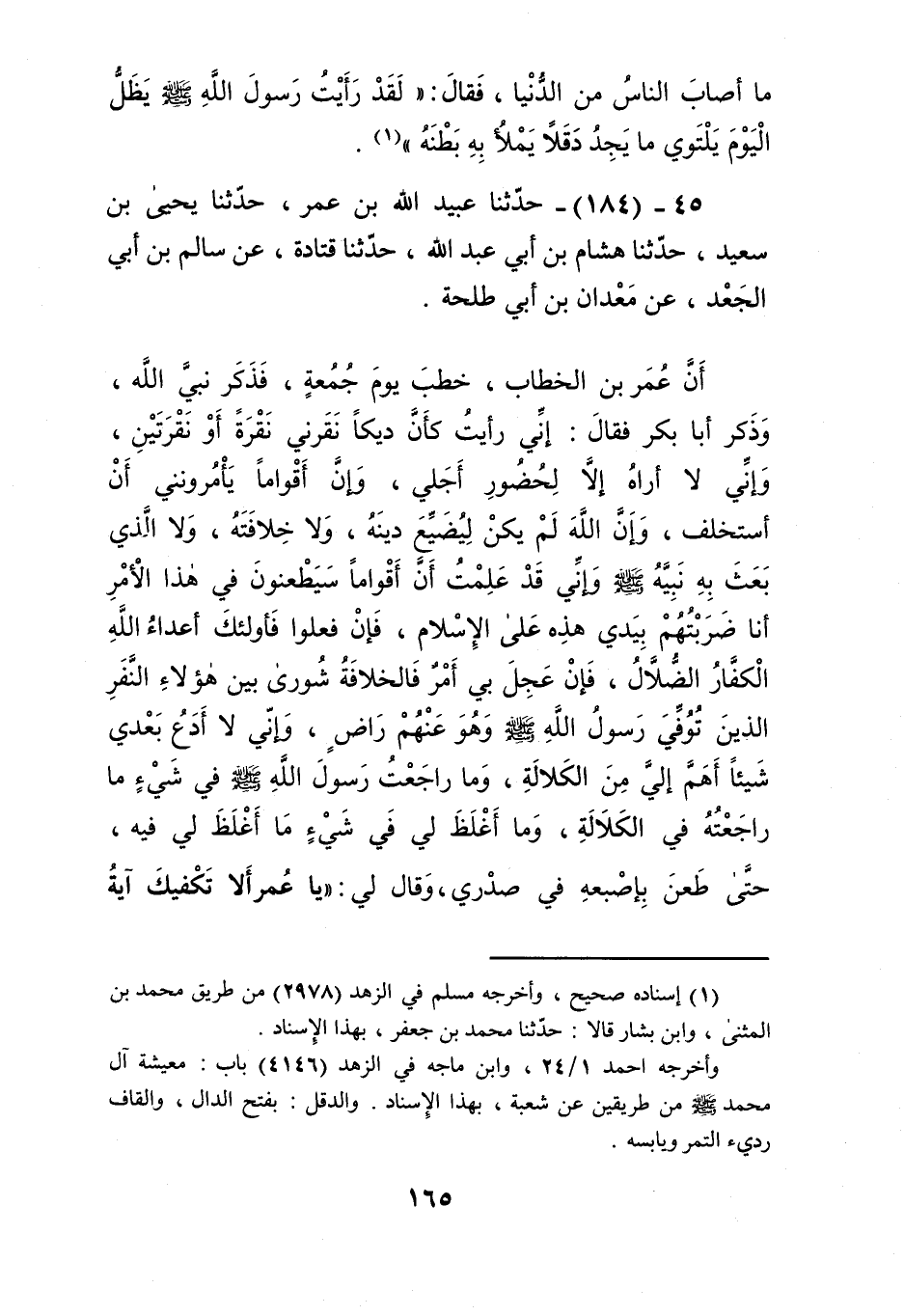 184 - حَدَّثَنَا عُبَيْدُ اللَّهِ بْنُ عُمَرَ، حَدَّثَنَا يَحْيَى بْنُ سَعِيدٍ، حَدَّثَنَا هِشَامُ بْنُ أَبِي عَبْدِ اللَّهِ، حَدَّثَنَا قَتَادَةُ، عَنْ سَالِمِ بْنِ أَبِي الْجَعْدِ، عَنْ مَعْدَانَ بْنِ أَبِي طَلْحَةَ، أَنَّ عُمَرَ بْنَ الْخَطَّابِ خَطَبَ يَوْمَ جُمُعَةٍ، فَذَكَرَ نَبِيَّ اللَّهِ، وَذَكَرَ أَبَا بَكْرٍ، فَقَالَ: إِنِّي رَأَيْتُ كَأَنَّ دِيكًا نَقَرَنِي نَقْرَةً أَوْ نَقْرَتَيْنِ، وَإِنِّي لَا أَرَاهُ إِلَّا لِحُضُورِ أَجْلِي، وَإِنَّ أَقْوَامًا يَأْمُرُونَنِي أَنْ أَسْتَخْلِفَ، وَإِنَّ اللَّهَ لَمْ يَكُنْ لِيُضَيِّعَ دِينَهُ، وَلَا خِلَافَتَهُ، وَلَا الَّذِي بَعَثَ بِهِ نَبِيَّهُ صَلَّى اللهُ عَلَيْهِ وَسَلَّمَ، وَإِنِّي قَدْ عَلِمْتُ أَنَّ أَقْوَامًا سَيَطْعَنُونَ فِي هَذَا الْأَمْرِ أَنَا ضَرَبْتُهُمْ بِيَدِي هَذِهِ عَلَى الْإِسْلَامِ، فَإِنْ فَعَلُوا فَأُولَئِكَ أَعْدَاءُ اللَّهِ الْكُفَّارُ الضَّلَالُ، فَإِنْ عَجِلَ بِي أَمْرٌ فَالْخِلَافَةُ شُورَى بَيْنَ هَؤُلَاءِ النَّفَرِ الَّذِينَ تُوُفِّيَ رَسُولُ اللَّهِ صَلَّى اللهُ عَلَيْهِ وَسَلَّمَ وَهُوَ عَنْهُمْ رَاضٍ، وَإِنِّي لَا أَدَعُ بَعْدِي شَيْئًا أَهَمَّ إِلَيَّ مِنَ الْكَلَالَةِ، وَمَا رَاجَعْتُ رَسُولَ اللَّهِ صَلَّى اللهُ عَلَيْهِ وَسَلَّمَ فِي شَيْءٍ مَا رَاجَعْتُهُ فِي الْكَلَالَةِ، وَمَا أَغْلَظَ لِي فِي شَيْءٍ مَا أَغْلَظَ لِي فِيهِ، حَتَّى طَعَنَ بِإِصْبَعِهِ فِي صَدْرِي، وَقَالَ لِي: «يَا عُمَرُ، §أَلَا تَكْفِيكَ آيَةُ الصَّيْفِ الَّتِي فِي آخِرِ سُورَةِ النِّسَاءِ؟ وَإِنِّي إِنْ أَعِشْ أَقْضِ فِيهِ بِقَضِيَّةٍ يَقْضِي بِهَا مَنْ يَقْرَأُ الْقُرْآنَ وَمَنْ لَا يَقْرَأُ الْقُرْآنَ». ثُمَّ قَالَ: اللَّهُمَّ إِنِّي أُشْهِدُكَ عَلَى أُمَرَاءِ الْأَمْصَارِ، فَإِنَّمَا بَعَثْتُهُمْ لِيُعَلِّمُوهُمْ دِينَهُمْ، وَسُنَّةَ نَبِيِّهِمْ، وَيَعْدِلُوا عَلَيْهِمْ، وَيَقْسِمُوا لَهُمْ فَيْئَهُمْ، وَيَرْفَعُوا إِلَيَّ مَا أَشْكَلَ مِنْ أَمْرِهِمْ عَلَيْهِمْ. ثُمَّ إِنَّكُمْ أَيُّهَا النَّاسُ تَأْكُلُونَ مِنْ شَجَرَتَيْنِ لَا أَرَاهُمَا إِلَّا خَبِيثَتَيْنِ: هَذَا الْبَصَلُ وَالثُّومُ، لَقَدْ رَأَيْتُ رَسُولَ اللَّهِ صَلَّى اللهُ عَلَيْهِ وَسَلَّمَ إِذَا وَجَدَ مِنَ الرَّجُلِ رِيحَهُمَا فِي الْمَسْجِدِ أَمْرَ بِهِ فَأُخْرِجَ إِلَى الْبَقِيعِ، فَمَنْ أَكَلَهُمَا فَلْيُمِتْهُمَا طَبْخًاKإسناده صحيح