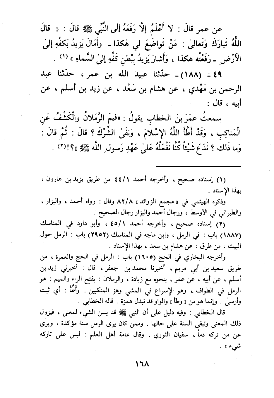 188 - حَدَّثَنَا عُبَيْدُ اللَّهِ بْنُ عُمَرَ، حَدَّثَنَا عَبْدُ الرَّحْمَنِ بْنُ مَهْدِيٍّ، عَنْ هِشَامِ بْنِ سَعْدٍ، عَنْ زَيْدِ بْنِ أَسْلَمَ، عَنْ أَبِيهِ، قَالَ: سَمِعْتُ عُمَرَ بْنَ الْخَطَّابِ، يَقُولُ: «§فِيمَ الرَّمَلَانُ وَالْكَشْفُ عَنِ الْمِنْاكِبِ، وَقَدْ أَطَّأَ اللَّهُ الْإِسْلَامَ، وَنَفَى الشِّرْكَ؟» قَالَ: ثُمَّ قَالَ: «وَمَا ذَلِكَ؟ نَدَعُ شَيْئًا كُنَّا نَفْعَلُهُ عَلَى عَهْدِ رَسُولِ اللَّهِ صَلَّى اللهُ عَلَيْهِ وَسَلَّمَ؟» Kإسناده صحيح