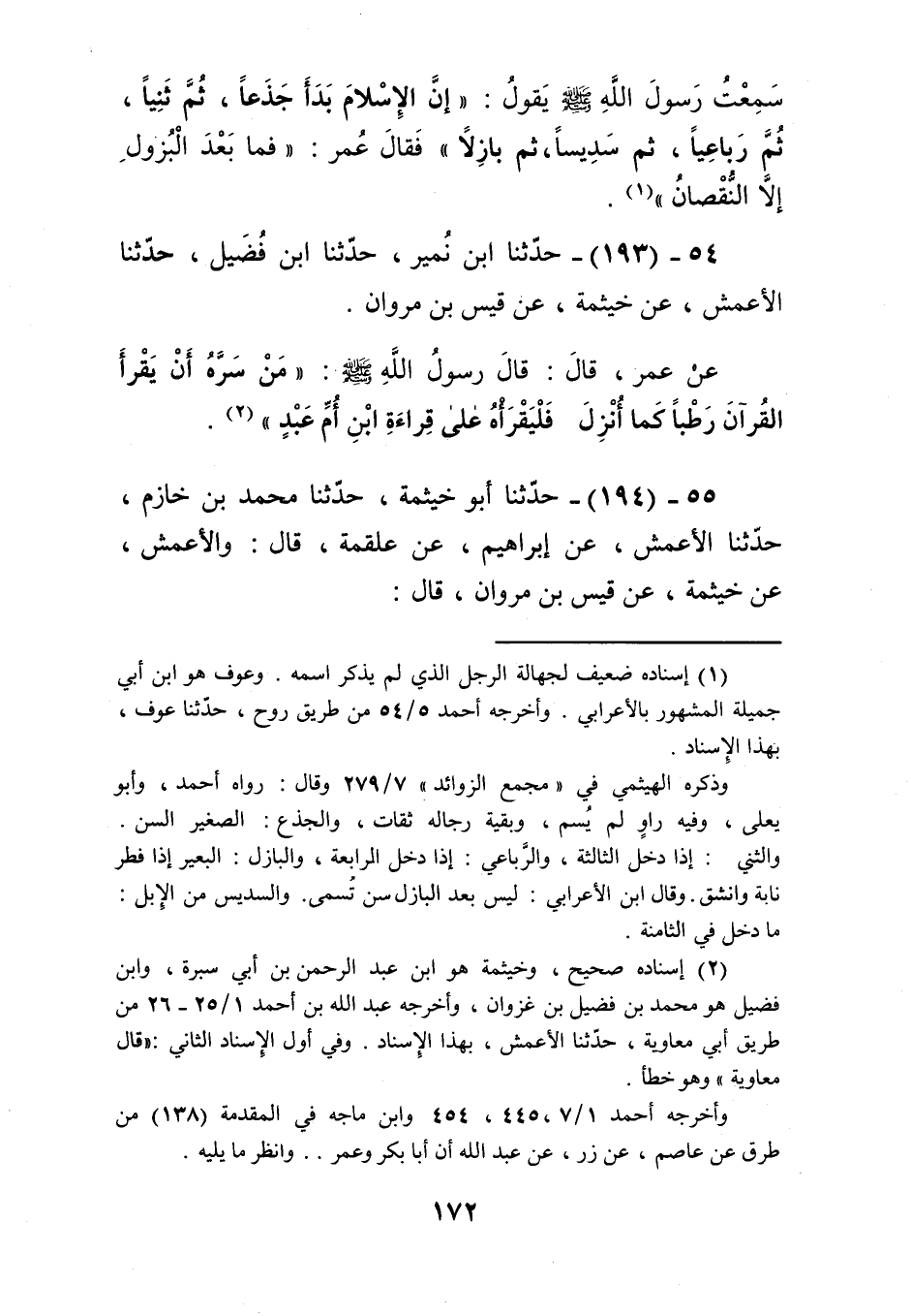 193 - حَدَّثَنَا ابْنُ نُمَيْرٍ، حَدَّثَنَا ابْنُ فُضَيْلٍ، حَدَّثَنَا الْأَعْمَشُ، عَنْ خَيْثَمَةَ، عَنْ قَيْسِ بْنِ مَرْوَانَ، عَنْ عُمَرَ، قَالَ: قَالَ رَسُولُ اللَّهِ صَلَّى اللهُ عَلَيْهِ وَسَلَّمَ: «§مَنْ سَرَّهُ أَنْ يَقْرَأَ الْقُرْآنَ رَطْبًا كَمَا أُنْزِلَ، فَلْيَقْرَأْهُ عَلَى قِرَاءَةِ ابْنِ أُمِّ عَبْدٍ» Kإسناده صحيح
