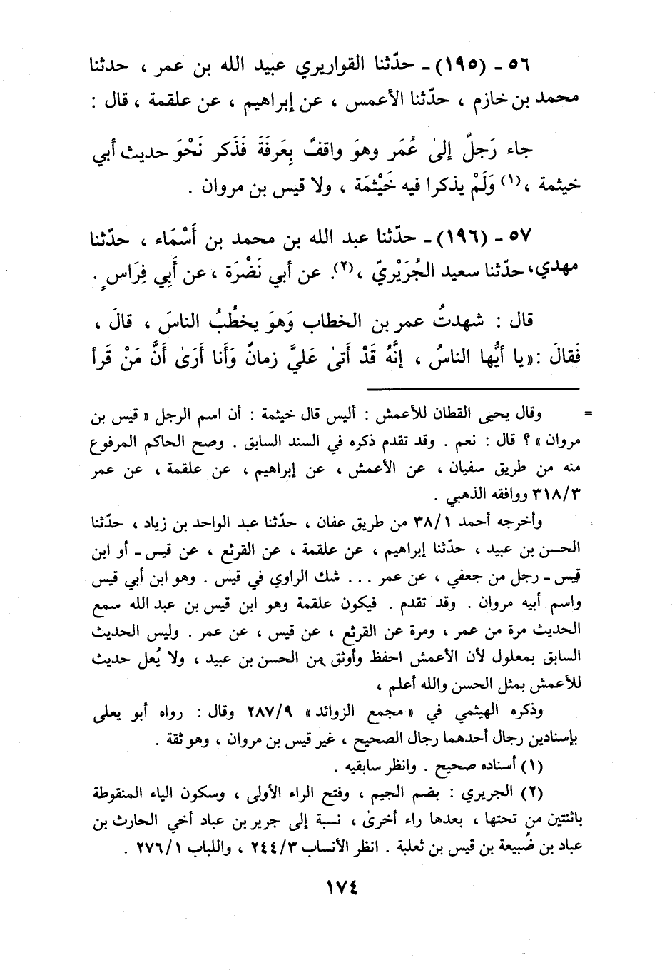 196 - حَدَّثَنَا عَبْدُ اللَّهِ بْنُ مُحَمَّدِ بْنِ أَسْمَاءٍ، حَدَّثَنَا مَهْدِيٌّ، حَدَّثَنَا سَعِيدٌ الْجُرَيْرِيُّ، عَنْ أَبِي نَضْرَةَ، عَنْ أَبِي فِرَاسٍ، قَالَ: شَهِدْتُ عُمَرَ بْنَ الْخَطَّابِ، وَهُوَ يَخْطُبُ النَّاسَ، قَالَ: فَقَالَ: يَا أَيُّهَا النَّاسُ، إِنَّهُ قَدْ أَتَى عَلَيَّ زَمَانٌ وَأَنَا أَرَى أَنَّ مَنْ قَرَأَ -[175]- الْقُرْآنَ يُرِيدُ اللَّهَ وَمَا عِنْدَهُ، فَيُخَيَّلُ إِلَيَّ أَنَّ قَوْمًا قَرَءُوهُ يُرِيدُونَ بِهِ النَّاسَ وَيُرِيدُونَ بِهِ الدُّنْيَا، أَلَا فَأَرِيدُوا اللَّهَ بِأَعْمَالِكُمْ، أَلَا إِنَّا إِنَّمَا كُنَّا نَعْرِفُكُمْ إِذْ يَنْزِلُ الْوَحْيُ، وَإِذِ النَّبِيُّ صَلَّى اللهُ عَلَيْهِ وَسَلَّمَ بَيْنَ أَظْهُرِنَا، وَإِذْ يُنَبِّئُنَا اللَّهُ مِنْ أَخْبَارِكُمْ، فَقَدِ انْقَطَعَ الْوَحْيُ، وَذَهَبَ نَبِيُّ اللَّهِ، فَإِنَّمَا نَعْرِفُكُمْ بِمَا نَقُولُ لَكُمْ، أَلَا مَنْ رَأَيْنَا مِنْهُ خَيْرًا ظَنَنَّا بِهِ خَيْرًا وَأَحْبَبْنَاهُ عَلَيْهِ، وَمَنْ رَأَيْنَا بِهِ شَرًّا ظَنَنَّا بِهِ شَرًّا وَأَبْغَضْنَاهُ عَلَيْهِ، سَرَائِرُكُمْ بَيْنَكُمْ وَبَيْنَ رَبِّكُمْ، أَلَا إِنِّي إِنَّمَا أَبْعَثُ عُمَّالِي لِيُعَلِّمُوكُمْ دِينَكُمْ، وَلِيُعَلِّمُوكُمْ سُنَنَكُمْ، وَلَا أَبْعَثُهُمْ لِيَضْرِبُوا ظُهُورَكُمْ، وَلَا لِيَأْخُذُوا أَمْوَالَكُمْ، أَلَا فَمَنْ رَابَهُ شَيْءٌ مِنْ ذَلِكَ فَلْيَرْفَعْهُ إِلَيَّ، فَوَالَّذِي نَفْسُ عُمَرَ بِيَدِهِ لَأُقِصَّنَّكُمْ مِنْهُ. قَالَ: فَقَامَ عَمْرُو بْنُ الْعَاصِ فَقَالَ: يَا أَمِيرَ الْمُؤْمِنِينَ، أَرَأَيْتَ إِنْ بَعَثْتَ عَامِلًا مِنْ عُمَّالِكَ فَأَدَّبَ رَجُلًا مِنْ أَهْلِ رَعِيَّتِهِ فَضَرَبَهُ، إِنَّكَ لَمُقِصَّهُ مِنْهُ؟ قَالَ: فَقَالَ: نَعَمْ، وَالَّذِي نَفْسُ عُمَرَ بِيَدِهِ لَأُقِصَّنَّ مِنْهُ، أَلَا أُقِصُّ وَقَدْ رَأَيْتُ رَسُولَ اللَّهِ صَلَّى اللهُ عَلَيْهِ وَسَلَّمَ «§يُقِصُّ مِنْ نَفْسِهِ؟» أَلَا لَا تَضْرِبُوا الْمُسْلِمِينَ فَتُذِلُّوهُمْ، وَلَا تَمْنَعُوهُمْ حُقُوقَهُمْ فَتُكَفِّرُوهُمْ، وَلَا تُجَمِّرُوهُمْ فَتَفْتِنُوهُمْ، وَلَا تُنْزِلُوهُمُ الْغِيَاضَ فَتُضَيِّعُوهُمْKأبو فراس قال الحافظ مقبول وباقي رجاله رجال الصحيح