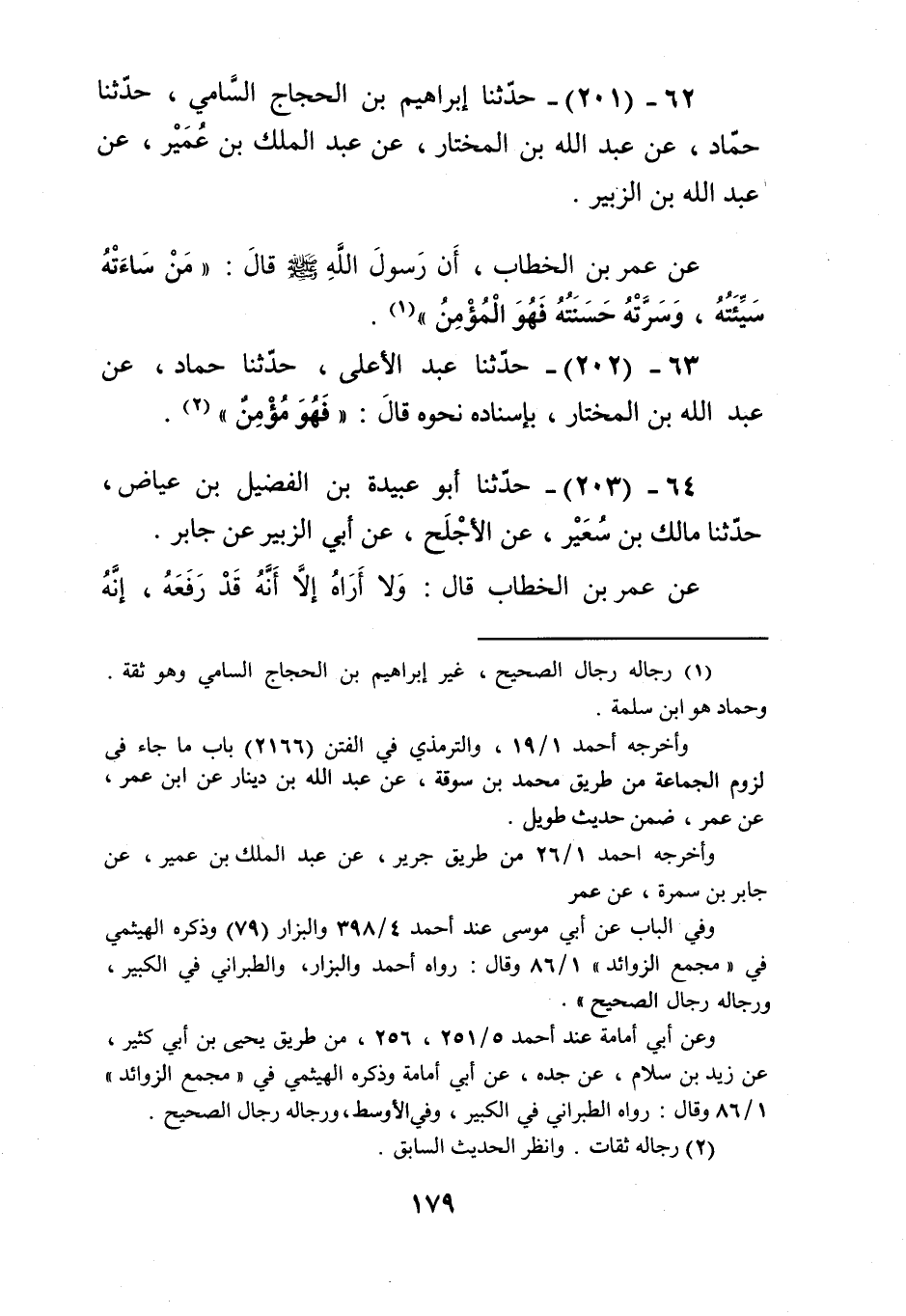 201 - حَدَّثَنَا إِبْرَاهِيمُ بْنُ الْحَجَّاجِ السَّامِيُّ، حَدَّثَنَا حَمَّادٌ، عَنْ عَبْدِ اللَّهِ بْنِ الْمُخْتَارِ، عَنْ عَبْدِ الْمَلِكِ بْنِ عُمَيْرٍ، عَنْ عَبْدِ اللَّهِ بْنِ الزُّبَيْرِ، عَنْ عُمَرَ بْنِ الْخَطَّابِ، أَنَّ رَسُولَ اللَّهِ صَلَّى اللهُ عَلَيْهِ وَسَلَّمَ قَالَ: «§مَنْ سَاءَتْهُ سَيِّئَتُهُ، وَسَرَّتْهُ حَسَنَتُهُ فَهُوَ الْمُؤْمِنُ».Kرجاله رجال الصحيح غير إبراهيم بن الحجاج السامي وهو ثقة