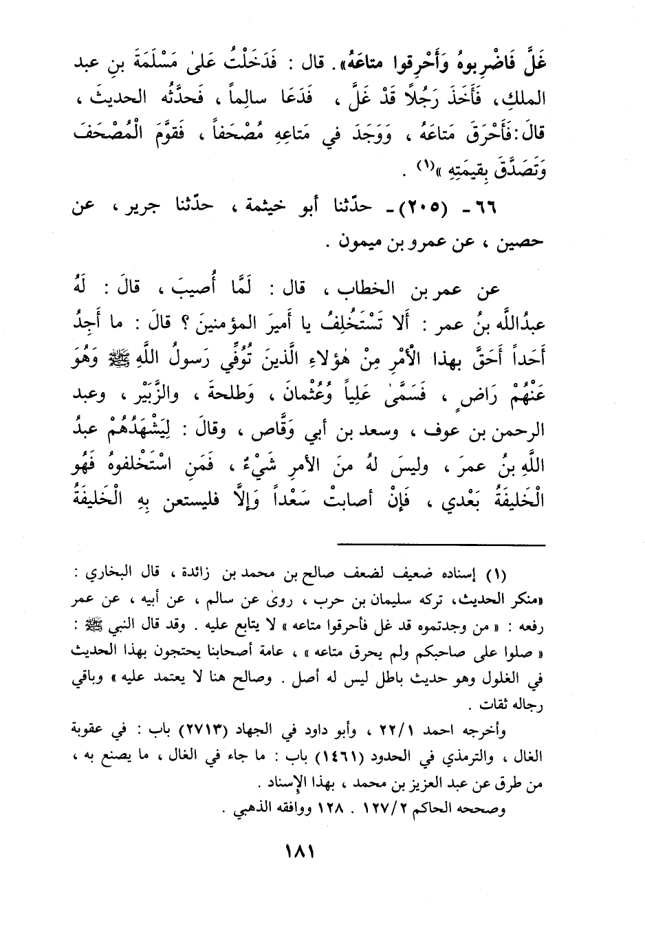 205 - حَدَّثَنَا أَبُو خَيْثَمَةَ، حَدَّثَنَا جَرِيرٌ، عَنْ حُصَيْنٍ، عَنْ عَمْرِو بْنِ مَيْمُونٍ، عَنْ عُمَرَ بْنِ الْخَطَّابِ، قَالَ لَمَّا أُصِيبَ، قَالَ لَهُ عَبْدُ اللَّهِ بْنُ عُمَرَ: أَلَا تَسْتَخْلِفُ يَا أَمِيرَ الْمُؤْمِنِينَ؟ قَالَ: «§مَا أَجِدُ أَحَدًا أَحَقَّ بِهَذَا الْأَمْرِ مِنْ هَؤُلَاءِ الَّذِينَ تُوُفِّيَ رَسُولُ اللَّهِ صَلَّى اللهُ عَلَيْهِ وَسَلَّمَ وَهُوُ عَنْهُمْ رَاضٍ، فَسَمَّى عَلِيًّا، وَعُثْمَانَ، وَطَلْحَةَ، وَالزُّبَيْرَ، وَعَبْدَ الرَّحْمَنِ بْنَ عَوْفٍ، وَسَعْدَ بْنَ أَبِي وَقَّاصٍ» وَقَالَ: «لِيَشْهَدُهُمْ عَبْدُ اللَّهِ بْنُ عُمَرَ، وَلَيْسَ لَهُ مِنَ الْأَمْرِ شَيْءٌ، فَمَنِ اسْتَخْلَفُوهُ فَهُوَ الْخَلِيفَةُ بَعْدِي، فَإِنْ أَصَابَتْ سَعْدًا وَإِلَّا فَلْيَسْتَعِنْ بِهِ الْخَلِيفَةُ بَعْدِي، فَإِنِّي لَمْ أَنْزِعْهُ مِنْ ضَعْفٍ وَلَا خِيَانَةٍ» Kإسناده صحيح