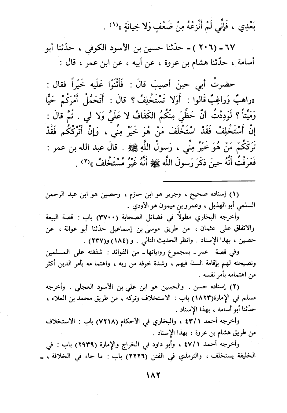 206 - حَدَّثَنَا حُسَيْنُ بْنُ الْأَسْوَدِ الْكُوفِيُّ، حَدَّثَنَا أَبُو أُسَامَةَ، حَدَّثَنَا هِشَامُ بْنُ عُرْوَةَ، عَنْ أَبِيهِ، عَنِ ابْنِ عُمَرَ، قَالَ: حَضَرْتُ أَبِي حِينَ أُصِيبَ، قَالَ: فَأَثْنَوْا عَلَيْهِ خَيْرًا، فَقَالَ: رَاهِبٌ وَرَاغِبٌ، قَالُوا: أَوْلَا تَسْتَخْلِفُ؟ قَالَ: أَتَحَمَّلُ أَمْرَكُمْ حَيًّا وَمَيِّتًا؟ لَوَدِدْتُ أَنَّ حَظِّي مِنْكُمُ الْكَفَافُ لَا عَلَيَّ وَلَا لِي. ثُمَّ قَالَ: " §إِنْ أَسْتَخْلِفْ فَقَدِ اسْتَخْلَفَ مَنْ هُوَ خَيْرٌ مِنِّي، وَإِنْ أَتْرُكْكُمْ فَقَدْ تَرَكَكُمْ مَنْ هُوَ خَيْرٌ مِنِّي: رَسُولُ اللَّهِ صَلَّى اللهُ عَلَيْهِ وَسَلَّمَ ". قَالَ عَبْدُ اللَّهِ بْنُ عُمَرَ: فَعَرَفْتُ أَنَّهُ حِينَ ذَكَرَ رَسُولَ اللَّهِ صَلَّى اللهُ عَلَيْهِ وَسَلَّمَ أَنَّهُ غَيْرُ مُسْتَخْلِفٌKإسناده حسن