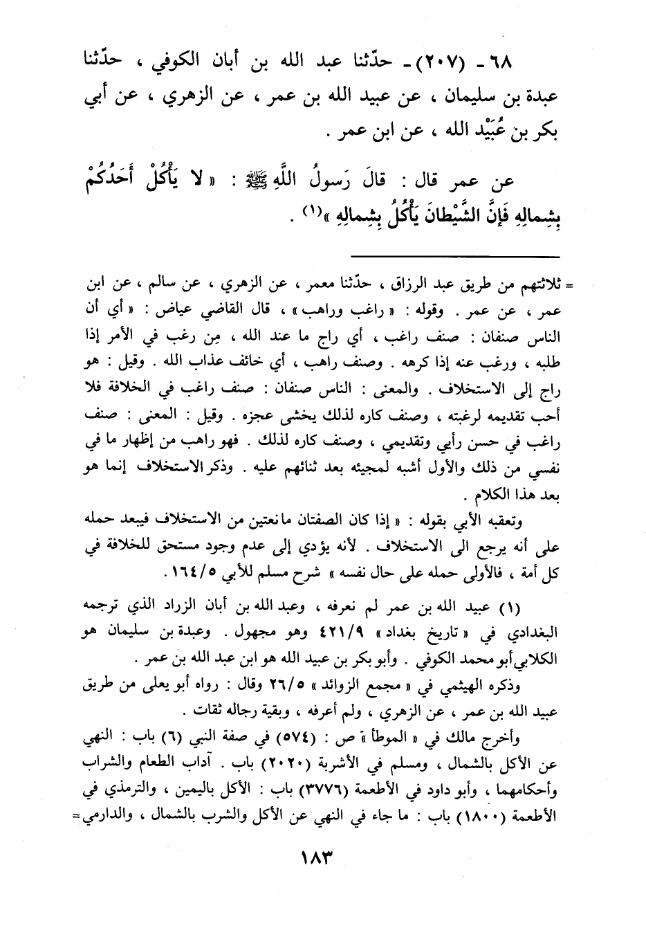 207 - حَدَّثَنَا عَبْدُ اللَّهِ بْنُ أَبَانَ الْكُوفِيُّ، حَدَّثَنَا عَبْدَةُ بْنُ سُلَيْمَانَ، عَنْ عُبَيْدِ اللَّهِ بْنِ عُمَرَ، عَنِ الزُّهْرِيِّ، عَنْ أَبِي بَكْرِ بْنِ عُبَيْدِ اللَّهِ، عَنِ ابْنِ عُمَرَ، عَنْ عُمَرَ، قَالَ: قَالَ رَسُولُ اللَّهِ صَلَّى اللهُ عَلَيْهِ وَسَلَّمَ: «§لَا يَأْكُلْ أَحَدُكُمْ بِشِمَالِهِ؛ فَإِنَّ الشَّيْطَانَ يَأْكُلُ بِشِمَالِهِ»