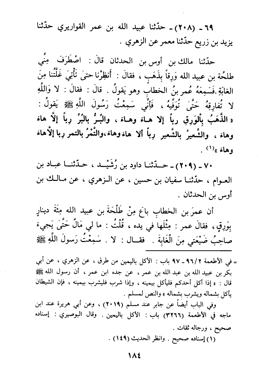 208 - حَدَّثَنَا عُبَيْدُ اللَّهِ بْنُ عُمَرَ الْقَوَارِيرِيُّ، حَدَّثَنَا يَزِيدُ بْنُ زُرَيْعٍ، حَدَّثَنَا مَعْمَرٌ، عَنِ الزُّهْرِيِّ، حَدَّثَنَا مَالِكُ بْنُ أَوْسِ بْنِ الْحَدَثَانِ، قَالَ: اصْطَرَفَ مِنِّي طَلْحَةُ بْنُ عُبَيْدِ اللَّهِ وَرِقًا بِذَهَبٍ، فَقَالَ: أَنْظِرْنَا حَتَّى تَأْتِيَ غَلَّتُنَا مِنَ الْغَابَةِ. فَسَمِعَهُ عُمَرُ بْنُ الْخَطَّابِ، وَهُوَ يَقُولُ، قَالَ: فَقَالَ: لَا وَاللَّهِ، لَا تُفَارِقْهُ حَتَّى تُوَفِّيَهُ، فَإِنِّي سَمِعْتُ رَسُولَ اللَّهِ صَلَّى اللهُ عَلَيْهِ وَسَلَّمَ يَقُولُ: «§الذَّهَبُ بِالْوَرِقِ رِبًا إِلَّا هَاءَ وَهَاءَ، وَالْبُرُّ بِالْبُرِّ رِبًا إِلَّا هَاءَ وَهَاءَ، وَالشَّعِيرُ بِالشَّعِيرِ رِبًا إِلَّا هَاءَ وَهَاءَ، وَالتَّمْرُ بِالتَّمْرِ رِبًا إِلَّا هَاءَ وَهَاءَ» Kإسناده صحيح