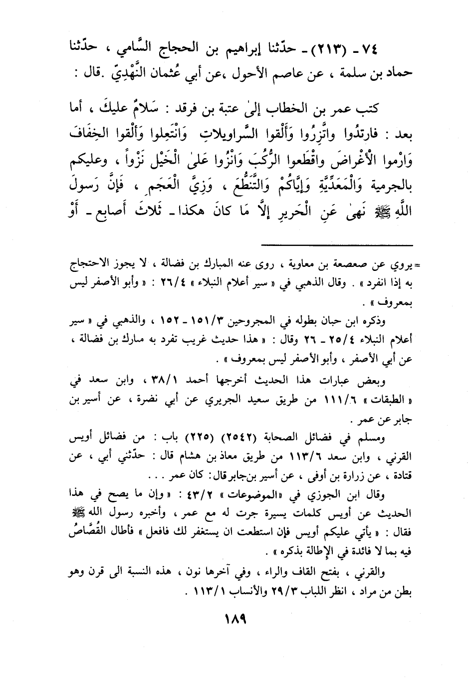 213 - حَدَّثَنَا إِبْرَاهِيمُ بْنُ الْحَجَّاجِ السَّامِيُّ، حَدَّثَنَا حَمَّادُ بْنُ سَلَمَةَ، عَنْ عَاصِمٍ الْأَحْوَلِ، عَنْ أَبِي عُثْمَانَ النَّهْدِيِّ، قَالَ: كَتَبَ عُمَرُ بْنُ الْخَطَّابِ إِلَى عُتْبَةَ بْنِ فَرْقَدٍ: سَلَامٌ عَلَيْكَ، أَمَّا بَعْدُ: فَارْتَدُوا وَاتَّزِرُوا وَأَلْقُوا السَّرَاوِيلَاتِ، وَانْتَعِلُوا وَأَلْقُوا الْخِفَافَ، وَارْمُوا الْأَغْرَاضَ وَاقْطَعُوا الرُّكُبَ، وَانْزَوْا عَلَى الْخَيْلِ نَزْوًا، وَعَلَيْكُمْ بِالْجُرَمِيَّةِ وَالْمَعَدِّيَّةِ، وَإِيَّاكُمْ وَالتَّنَطُّعَ، وَزِيَّ الْعَجَمِ، فَإِنَّ رَسُولَ اللَّهِ صَلَّى اللهُ عَلَيْهِ وَسَلَّمَ «§نَهَى عَنِ الْحَرِيرِ إِلَّا مَا كَانَ هَكَذَا، ثَلَاثَ أَصَابِعَ، أَوْ هَكَذَا أَرْبَعَ أَصَابِعَ» Kإسناده صحيح