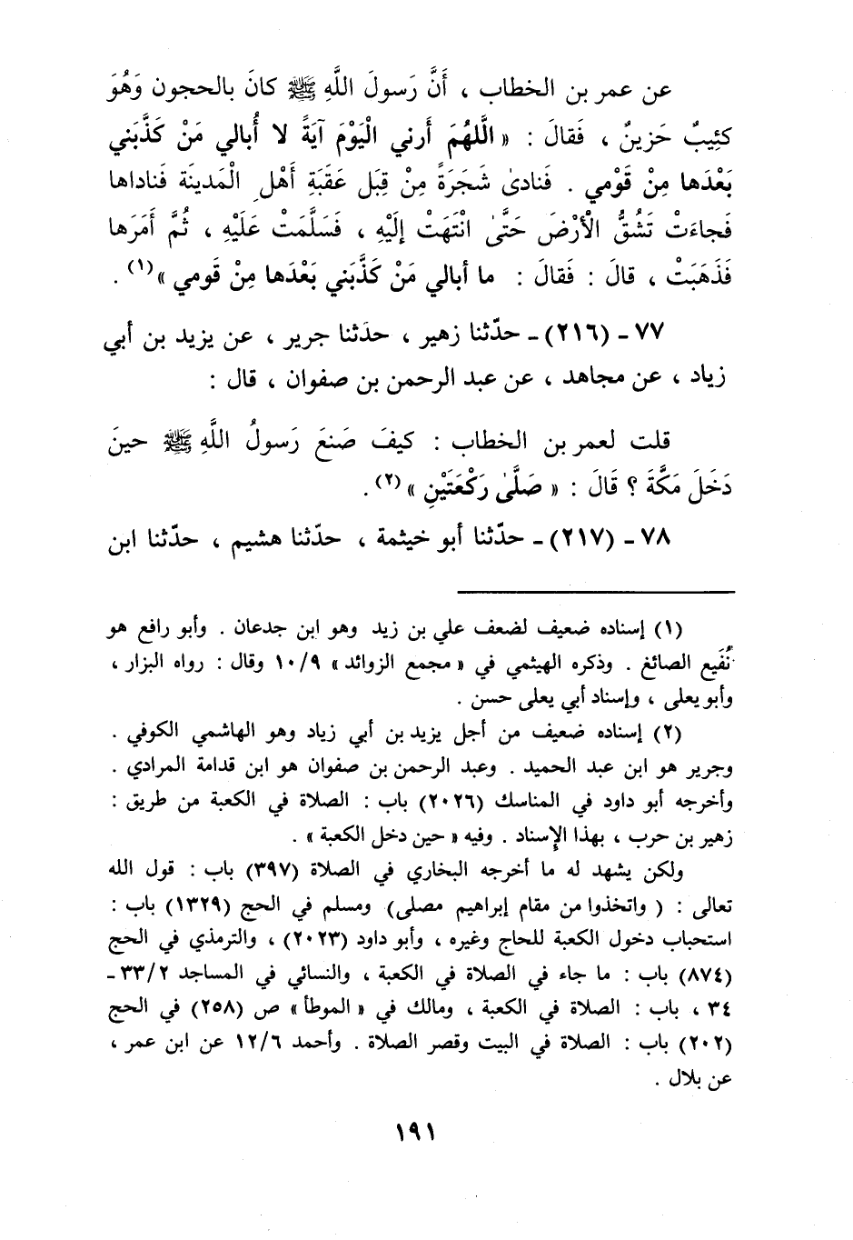216 - حَدَّثَنَا زُهَيْرٌ، حَدَّثَنَا جَرِيرٌ، عَنْ يَزِيدَ بْنِ أَبِي زِيَادٍ، عَنْ مُجَاهِدٍ، عَنْ عَبْدِ الرَّحْمَنِ بْنِ صَفْوَانَ، قَالَ: قُلْتُ لِعُمَرَ بْنِ الْخَطَّابِ: كَيْفَ صَنَعَ رَسُولُ اللَّهِ صَلَّى اللهُ عَلَيْهِ وَسَلَّمَ حِينَ دَخَلَ مَكَّةَ؟ قَالَ: «§صَلَّى رَكْعَتَيْنِ» Kإسناده ضعيف