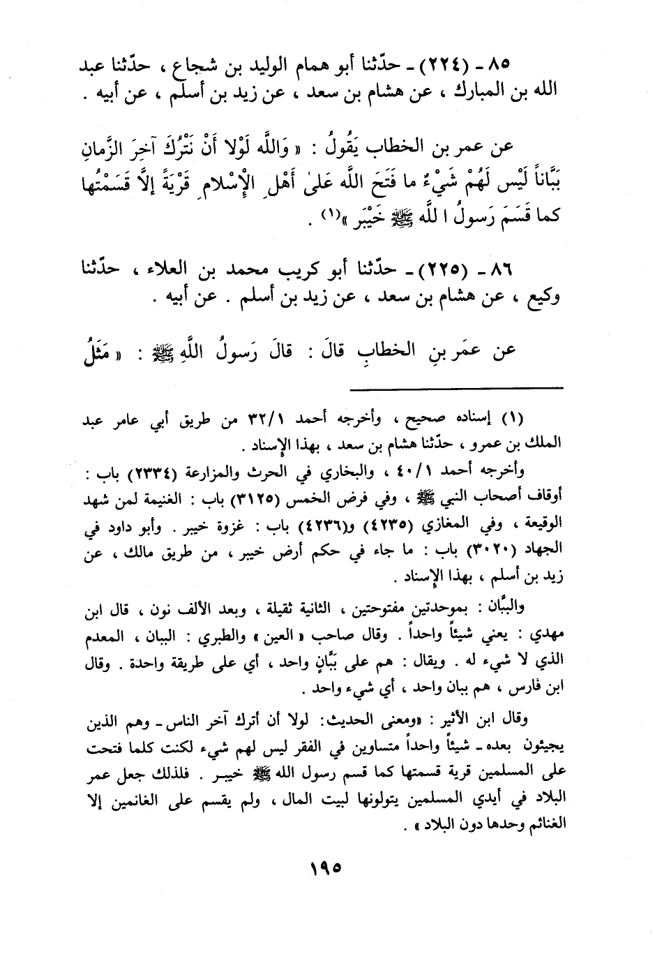 224 - حَدَّثَنَا أَبُو هَمَّامٍ الْوَلِيدُ بْنُ شُجَاعٍ، حَدَّثَنَا عَبْدُ اللَّهِ بْنُ الْمُبَارَكِ، عَنْ هِشَامِ بْنِ سَعْدٍ، عَنْ زَيْدِ بْنِ أَسْلَمَ، عَنْ أَبِيهِ، عَنْ عُمَرَ بْنِ الْخَطَّابِ، يَقُولُ: وَاللَّهِ لَوْلَا أَنْ نَتْرُكَ آخِرَ الزَّمَانِ بَبَّانًا لَيْسَ لَهُمْ شَيْءٌ، مَا فَتْحَ اللَّهُ عَلَى أَهْلِ الْإِسْلَامِ قَرْيَةً إِلَّا قَسَمْتُهَا كَمَا «§قَسَمَ رَسُولُ اللَّهِ صَلَّى اللهُ عَلَيْهِ وَسَلَّمَ خَيْبَرَ» Kإسناده صحيح