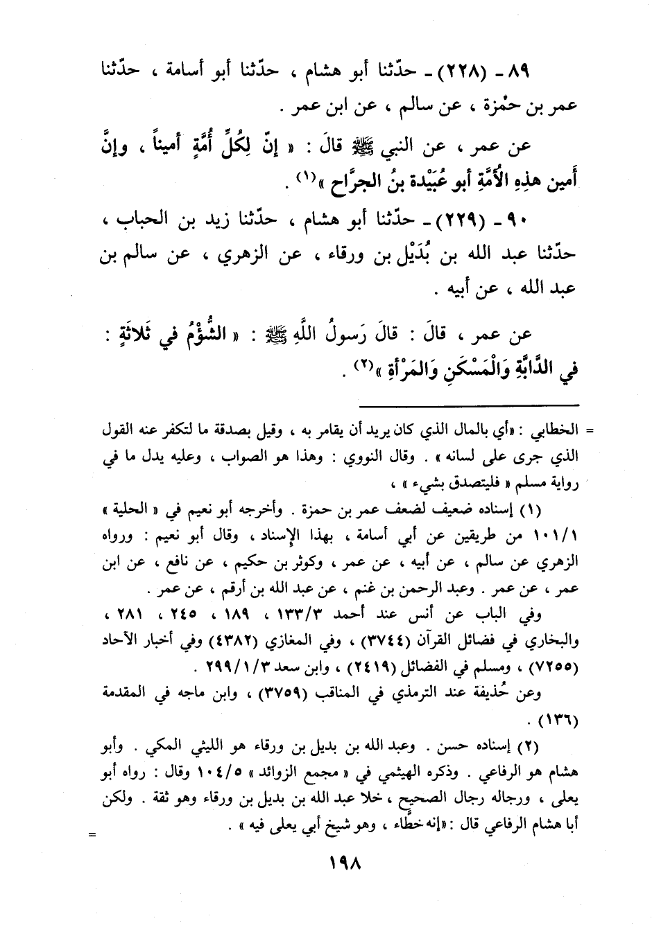 228 - حَدَّثَنَا أَبُو هِشَامٍ، حَدَّثَنَا أَبُو أُسَامَةَ، حَدَّثَنَا عُمَرُ بْنُ حَمْزَةَ، عَنْ سَالِمٍ، عَنِ ابْنِ عُمَرَ، عَنْ عُمَرَ، عَنِ النَّبِيِّ صَلَّى اللهُ عَلَيْهِ وَسَلَّمَ، قَالَ: «§إِنَّ لِكُلِّ أُمَّةٍ أَمِينًا، وَإِنَّ أَمِينَ هَذِهِ الْأُمَّةِ أَبُوعُبَيْدَةَ بْنُ الْجَرَّاحِ» Kإسناده ضعيف