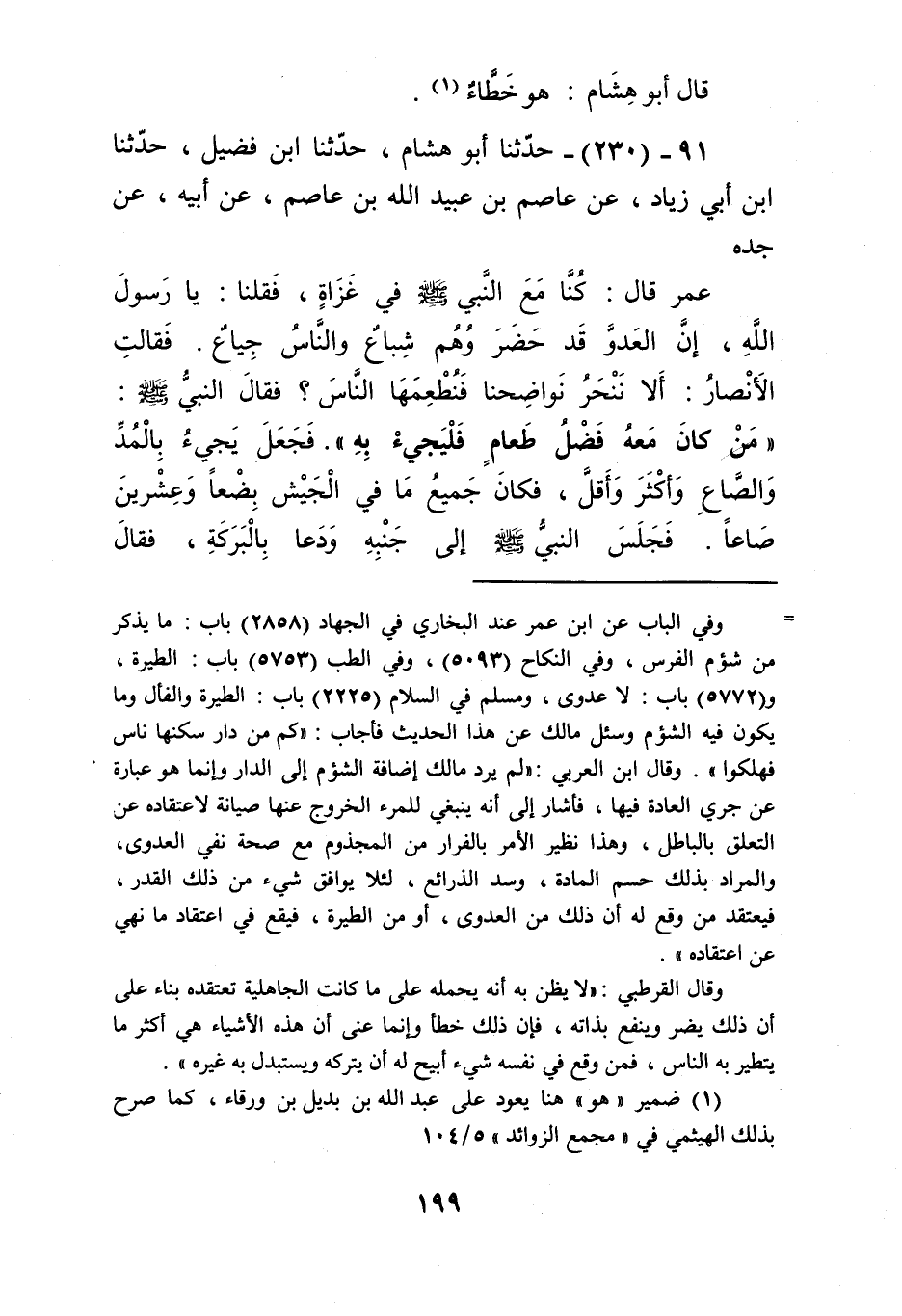 230 - حَدَّثَنَا أَبُو هِشَامٍ، حَدَّثَنَا ابْنُ فُضَيْلٍ، حَدَّثَنَا ابْنُ أَبِي زِيَادٍ، عَنْ عَاصِمِ بْنِ عُبَيْدِ اللَّهِ بْنِ عَاصِمٍ، عَنْ أَبِيهِ، عَنْ جَدِّهِ عُمَرَ، قَالَ: كُنَّا مَعَ النَّبِيِّ صَلَّى اللهُ عَلَيْهِ وَسَلَّمَ فِي غَزَاةٍ، فَقُلْنَا: يَا رَسُولَ اللَّهِ، إِنَّ الْعَدُوَّ قَدْ حَضَرَ وَهُمْ شِبَاعٌ وَالنَّاسُ جِيَاعٌ، فَقَالَتِ الْأَنْصَارُ: أَلَا نَنْحَرُ نَوَاضِحَنَا فَنُطْعِمَهَا النَّاسَ؟ فَقَالَ النَّبِيُّ صَلَّى اللهُ عَلَيْهِ وَسَلَّمَ: «§مَنْ كَانَ مَعَهُ فَضْلُ طَعَامٍ فَلْيَجِئْ بِهِ». فَجَعَلَ يَجِيءُ بِالْمُدِّ وَالصَّاعِ وَأَكْثَرَ وَأَقَلَّ، فَكَانَ جَمِيعُ مَا فِي الْجَيْشِ بِضْعًا وَعِشْرِينَ صَاعًا. فَجَلَسَ النَّبِيُّ صَلَّى اللهُ عَلَيْهِ وَسَلَّمَ إِلَى جَنْبِهِ وَدَعَا بِالْبَرَكَةِ، فَقَالَ النَّبِيُّ صَلَّى اللهُ عَلَيْهِ وَسَلَّمَ: «خُذُوا وَلَا تَنْتَهِبُوا». فَجَعَلَ الرَّجُلُ يَأْخُذُ فِي جِرَابِهِ وَفِي غِرَارَتِهِ، وَأَخَذُوا فِي أَوْعِيَتِهِمْ، حَتَّى إِنَّ الرَّجُلَ لَيَرْبِطُ كُمَّ قَمِيصِهِ فَيَمْلَأُهُ، فَفَرَغُوا وَالطَّعَامُ كَمَا هُوَ. ثُمَّ قَالَ النَّبِيُّ صَلَّى اللهُ عَلَيْهِ وَسَلَّمَ: «أَشْهَدُ أَنْ لَا إِلَهَ إِلَّا اللَّهُ وَأَنِّي رَسُولُ اللَّهِ، لَا يَأْتِي بِهِمَا عَبْدٌ مُحِقٌّ إِلَّا وَقَاهُ اللَّهُ حَرَّ النَّارِ» Kإسناده فيه ضعيفان