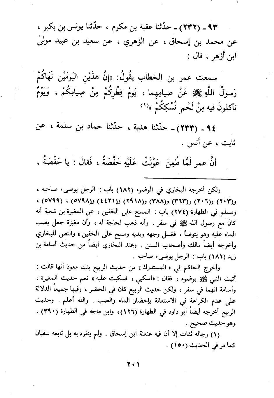 232 - حَدَّثَنَا عُقْبَةُ بْنُ مُكْرَمٍ، حَدَّثَنَا يُونُسُ بْنُ بُكَيْرٍ، عَنْ مُحَمَّدِ بْنِ إِسْحَاقَ، عَنِ الزُّهْرِيِّ، عَنْ سَعِيدِ بْنِ عُبَيْدٍ، مَوْلَى ابْنِ أَزْهَرَ، قَالَ: سَمِعْتُ عُمَرَ بْنَ الْخَطَّابِ، يَقُولُ: «إِنَّ §هَذَيْنِ الْيَوْمَيْنِ نَهَاكُمْ رَسُولُ اللَّهِ صَلَّى اللهُ عَلَيْهِ وَسَلَّمَ عَنْ صِيَامِهِمَا، يَوْمُ فِطْرِكُمْ مِنْ صِيَامِكُمْ، وَيَوْمٌ تَأْكُلُونَ فِيهِ مِنْ لَحْمِ نُسُكِكُمْ» Kرجاله ثقات إلا أن فيه عنعنة ابن إسحاق