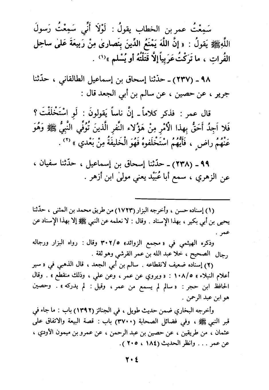 237 - حَدَّثَنَا إِسْحَاقُ بْنُ إِسْمَاعِيلَ الطَّالْقَانِيُّ، حَدَّثَنَا جَرِيرٌ، عَنْ حُصَيْنٍ، عَنْ سَالِمِ بْنِ أَبِي الْجَعْدِ، قَالَ: قَالَ عُمَرُ:، فَذَكَرَ كَلَامًا، إِنَّ نَاسًا يَقُولُونَ: «§لَوِ اسْتَخْلَفْتَ؟ فَلَا أَجِدُ أَحَقَّ بِهَذَا الْأَمْرِ مِنْ هَؤُلَاءِ النَّفَرِ الَّذِينَ تُوُفِّيَ النَّبِيُّ صَلَّى اللهُ عَلَيْهِ وَسَلَّمَ وَهُوَ عَنْهُمْ رَاضٍ، فَأَيُّهُمُ اسْتَخْلَفُوهُ فَهُوَ الْخَلِيفَةُ مِنْ بَعْدِي» Kإسناده ضعيف