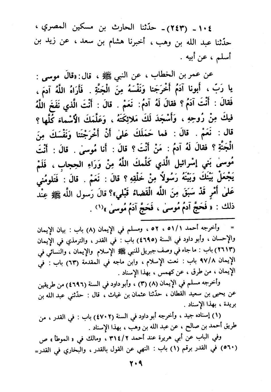 243 - حَدَّثَنَا الْحَارِثُ بْنُ مِسْكِينٍ الْمِصْرِيُّ، حَدَّثَنَا عَبْدُ اللَّهِ بْنُ وَهْبٍ، أَخْبَرَنَا هِشَامُ بْنُ سَعْدٍ، عَنْ زَيْدِ بْنِ أَسْلَمَ، عَنْ أَبِيهِ، عَنْ عُمَرَ بْنِ الْخَطَّابِ، عَنِ النَّبِيِّ صَلَّى اللهُ عَلَيْهِ وَسَلَّمَ قَالَ: " قَالَ مُوسَى: يَا رَبِّ، أَبُونَا آدَمُ أَخْرَجَنَا وَنَفْسَهُ مِنَ الْجَنَّةِ. فَأَرَاهُ اللَّهُ آدَمَ، فَقَالَ: أَنْتَ آدَمُ؟ فَقَالَ لَهُ آدَمُ: نَعَمْ. قَالَ: أَنْتَ الَّذِي نَفَخَ اللَّهُ فِيكَ مِنْ رُوحِهِ، وَأَسْجَدَ لَكَ مَلَائِكَتَهُ، وَعَلَّمَكَ الْأَسْمَاءَ كُلَّهَا؟ قَالَ: نَعَمْ. قَالَ: فَمَا حَمَلَكَ عَلَى أَنْ أَخْرَجْتَنَا وَنَفْسَكَ مِنَ الْجَنَّةِ؟ فَقَالَ لَهُ آدَمُ: مَنْ أَنْتَ؟ قَالَ: أَنَا مُوسَى. قَالَ: أَنْتَ مُوسَى بَنِي إِسْرَائِيلَ الَّذِي كَلَّمَكَ اللَّهُ مِنْ وَرَاءِ الْحِجَابِ، فَلَمْ يَجْعَلْ بَيْنَكَ وَبَيْنَهُ رَسُولًا مِنْ خَلْقِهِ؟ قَالَ: نَعَمْ. قَالَ: فَتَلُومُنِي عَلَى أَمْرٍ قَدْ سَبَقَ مِنَ اللَّهِ الْقَضَاءُ قَبْلِي؟ " قَالَ رَسُولُ اللَّهِ صَلَّى اللهُ عَلَيْهِ وَسَلَّمَ عِنْدَ ذَلِكَ: «§فَحَجَّ آدَمُ مُوسَى، فَحَجَّ آدَمُ مُوسَى» Kإسناده جيد