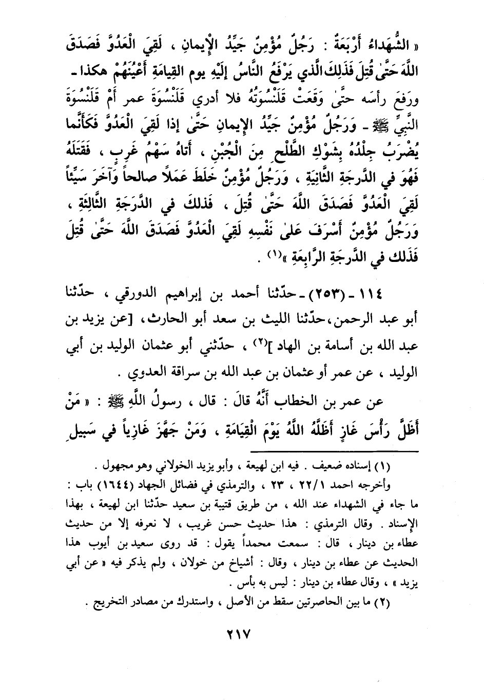 253 - حَدَّثَنَا أَحْمَدُ بْنُ إِبْرَاهِيمَ الدَّوْرَقِيُّ، حَدَّثَنَا أَبُو عَبْدِ الرَّحْمَنِ، حَدَّثَنَا اللَّيْثُ بْنُ سَعْدٍ أَبُو الْحَارِثِ، عَنْ يَزِيدَ بْنِ عَبْدِ اللَّهِ بْنِ أُسَامَةَ بْنِ الْهَادِ، حَدَّثَنِي أَبُو عُثْمَانَ الْوَلِيدُ بْنُ أَبِي الْوَلِيدِ، عَنْ عُمَرَ، أَوْ عُثْمَانَ بْنِ عَبْدِ اللَّهِ بْنِ سُرَاقَةَ الْعَدَوِيِّ، عَنْ عُمَرَ بْنِ الْخَطَّابِ، أَنَّهُ قَالَ: قَالَ رَسُولُ اللَّهِ صَلَّى اللهُ عَلَيْهِ وَسَلَّمَ: «§مَنْ أَظَلَّ رَأْسَ غَازٍ أَظَلَّهُ اللَّهُ يَوْمَ الْقِيَامَةِ، وَمَنْ جَهَّزَ غَازِيًا فِي سَبِيلِ اللَّهِ بِجَهَازِهِ فَلَهُ أَجْرُهُ، وَمَنْ بَنَى مَسْجِدًا يُذْكَرُ فِيهِ اسْمُ اللَّهِ، بَنَى اللَّهُ لَهُ بَيْتًا فِي الْجَنَّةِ» Kإسناده ضعيف