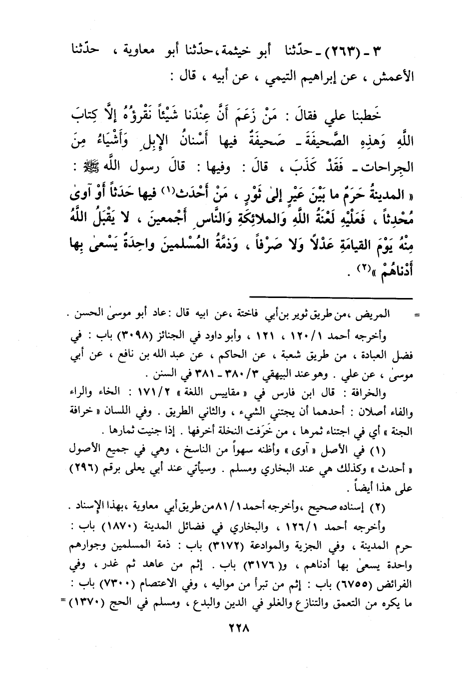 263 - حَدَّثَنَا أَبُو خَيْثَمَةَ، حَدَّثَنَا أَبُو مُعَاوِيَةَ، حَدَّثَنَا الْأَعْمَشُ، عَنْ إِبْرَاهِيمَ التَّيْمِيِّ، عَنْ أَبِيهِ، قَالَ: خَطَبَنَا عَلِيٌّ، فَقَالَ: مَنْ زَعَمَ أَنَّ عِنْدَنَا شَيْئًا نَقْرَؤُهُ إِلَّا كِتَابَ اللَّهِ وَهَذِهِ الصَّحِيفَةَ، صَحِيفَةٌ فِيهَا أَسْنَانُ الْإِبِلِ وَأَشْيَاءُ مِنَ الْجِرَاحَاتِ، فَقَدْ كَذَبَ، قَالَ: وَفِيهَا قَالَ رَسُولُ اللَّهِ صَلَّى اللهُ عَلَيْهِ وَسَلَّمَ: «§الْمَدِينَةُ حَرَمٌ مَا بَيْنَ عَيْرٍ إِلَى ثَوْرٍ، مَنْ أَحْدَثَ فِيهَا حَدَثًا أَوْ آوَى مُحْدِثًا، فَعَلَيْهِ لَعْنَةُ اللَّهِ وَالْمَلَائِكَةِ وَالنَّاسِ أَجْمَعِينَ، لَا يَقْبَلُ اللَّهُ مِنْهُ يَوْمَ الْقِيَامَةِ عَدْلًا وَلَا صَرْفًا، وَذِمَّةُ الْمُسْلِمِينَ وَاحِدَةٌ، يَسْعَى بِهَا أَدْنَاهُمْ» Kإسناده صحيح
