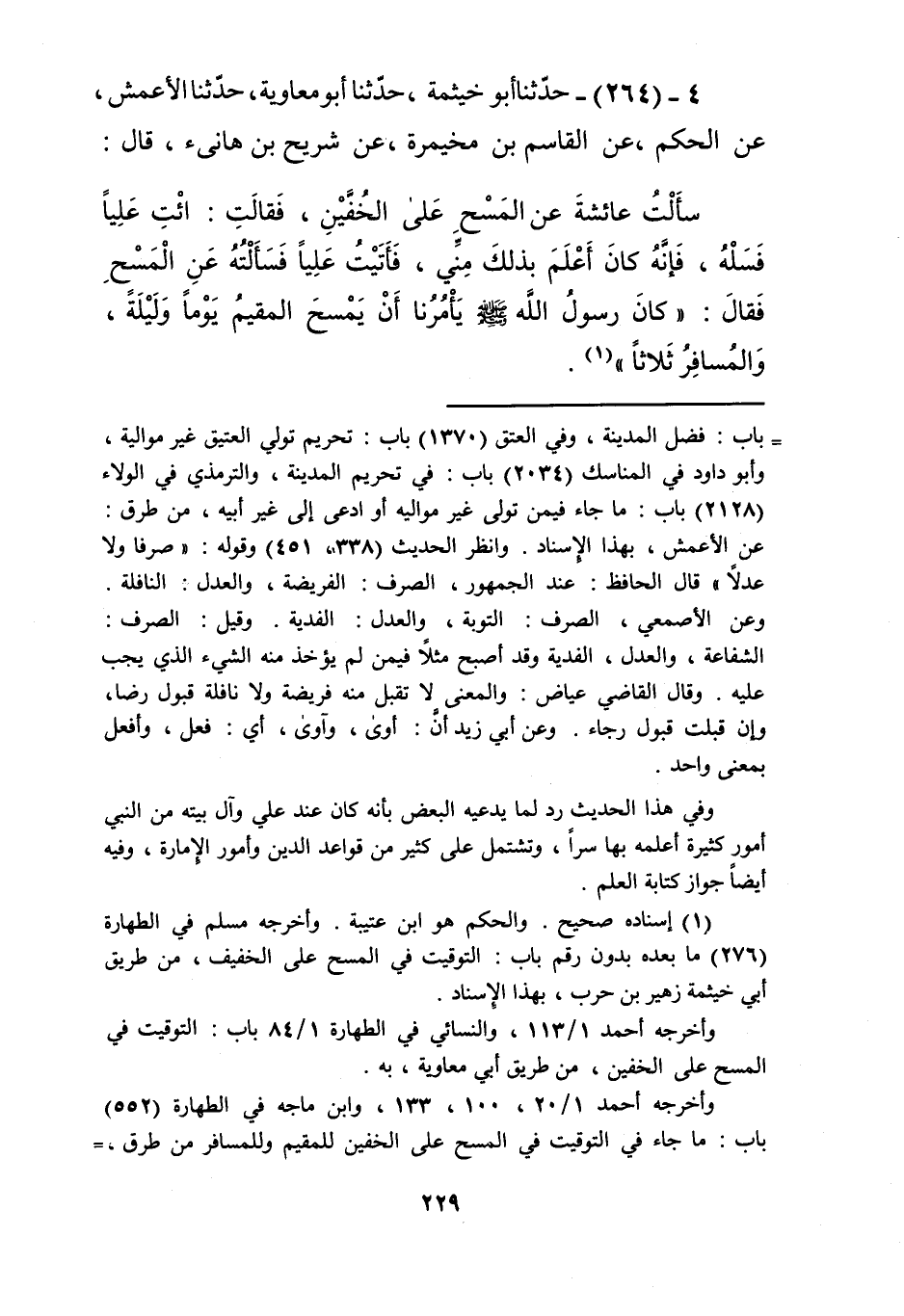 264 - حَدَّثَنَا أَبُو خَيْثَمَةَ، حَدَّثَنَا أَبُو مُعَاوِيَةَ، حَدَّثَنَا الْأَعْمَشُ، عَنِ الْحَكَمِ، عَنِ الْقَاسِمِ بْنِ مُخَيْمِرَةَ، عَنْ شُرَيْحِ بْنِ هَانِئٍ، قَالَ: سَأَلْتُ عَائِشَةَ، عَنِ الْمَسْحِ عَلَى الْخُفَّيْنِ، فَقَالَتِ: ائْتِ عَلِيًّا فَسَلْهُ، فَإِنَّهُ كَانَ أَعْلَمَ بِذَلِكَ مِنِّي، فَأَتَيْتُ عَلِيًّا فَسَأَلْتُهُ عَنِ الْمَسْحِ، فَقَالَ: كَانَ رَسُولُ اللَّهِ صَلَّى اللهُ عَلَيْهِ وَسَلَّمَ «§يَأْمُرُنَا أَنْ يَمْسَحَ الْمُقِيمُ يَوْمًا وَلَيْلَةً، وَالْمُسَافِرُ ثَلَاثًا» Kإسناده صحيح