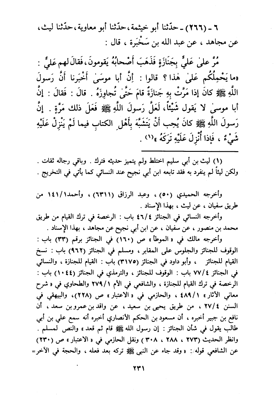 266 - حَدَّثَنَا أَبُو خَيْثَمَةَ، حَدَّثَنَا أَبُو مُعَاوِيَةَ، حَدَّثَنَا لَيْثٌ، عَنْ مُجَاهِدٍ، عَنْ عَبْدِ اللَّهِ بْنِ سَخْبَرَةَ، قَالَ: مُرَّ عَلَى عَلِيٍّ بِجِنَازَةٍ فَذَهَبَ أَصْحَابُهُ يَقُومُونَ، فَقَالَ لَهُمْ عَلِيٌّ: مَا يَحْمِلُكُمْ عَلَى هَذَا؟ قَالُوا: إِنَّ أَبَا مُوسَى أَخْبَرَنَا أَنَّ رَسُولَ اللَّهِ صَلَّى اللهُ عَلَيْهِ وَسَلَّمَ كَانَ إِذَا مَرَّتْ بِهِ جِنَازَةٌ قَامَ حَتَّى تُجَاوِزَهُ، قَالَ: فَقَالَ: إِنَّ أَبَا مُوسَى لَا يَقُولُ شَيْئًا، لَعَلَّ رَسُولَ اللَّهِ صَلَّى اللهُ عَلَيْهِ وَسَلَّمَ فَعَلَ ذَلِكَ مَرَّةً، إِنَّ رَسُولَ اللَّهِ صَلَّى اللهُ عَلَيْهِ وَسَلَّمَ كَانَ «§يُحِبُّ أَنْ يَتَشَبَّهَ بِأَهْلِ الْكِتَابِ فِيمَا لَمْ يَنْزِلْ عَلَيْهِ شَيْءٌ، فَإِذَا أُنْزِلَ عَلَيْهِ تَرَكَهُ» Kليث بن أبي سلم اختلط وباقي رجاله ثقات